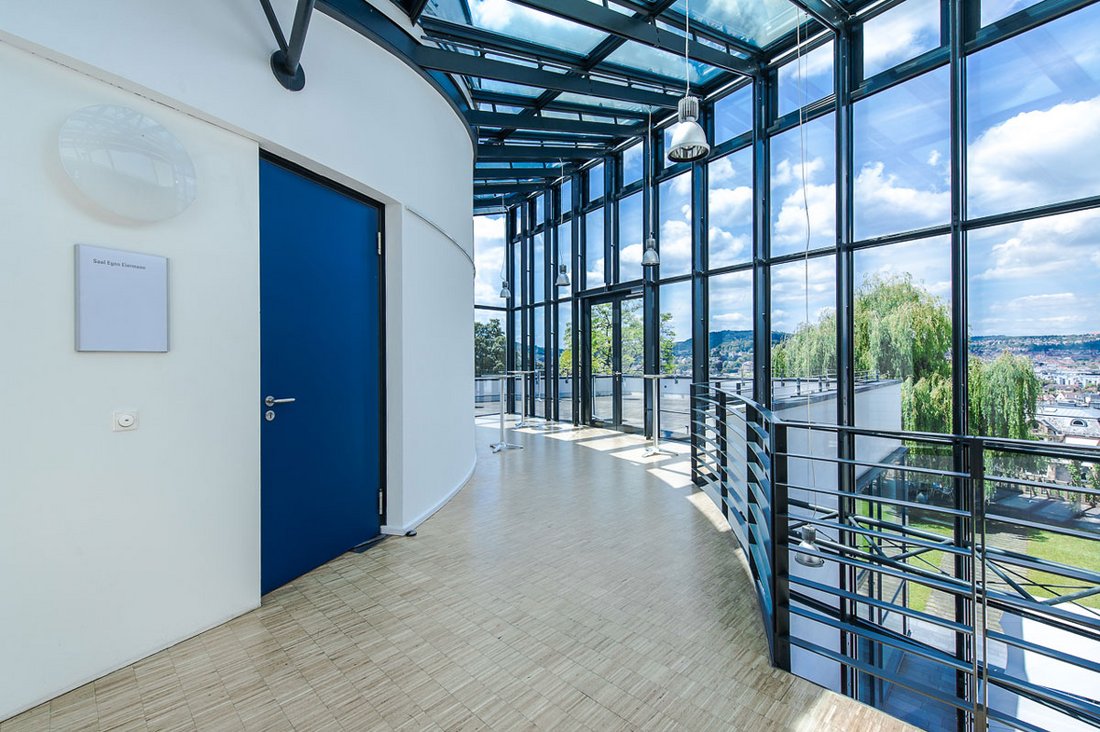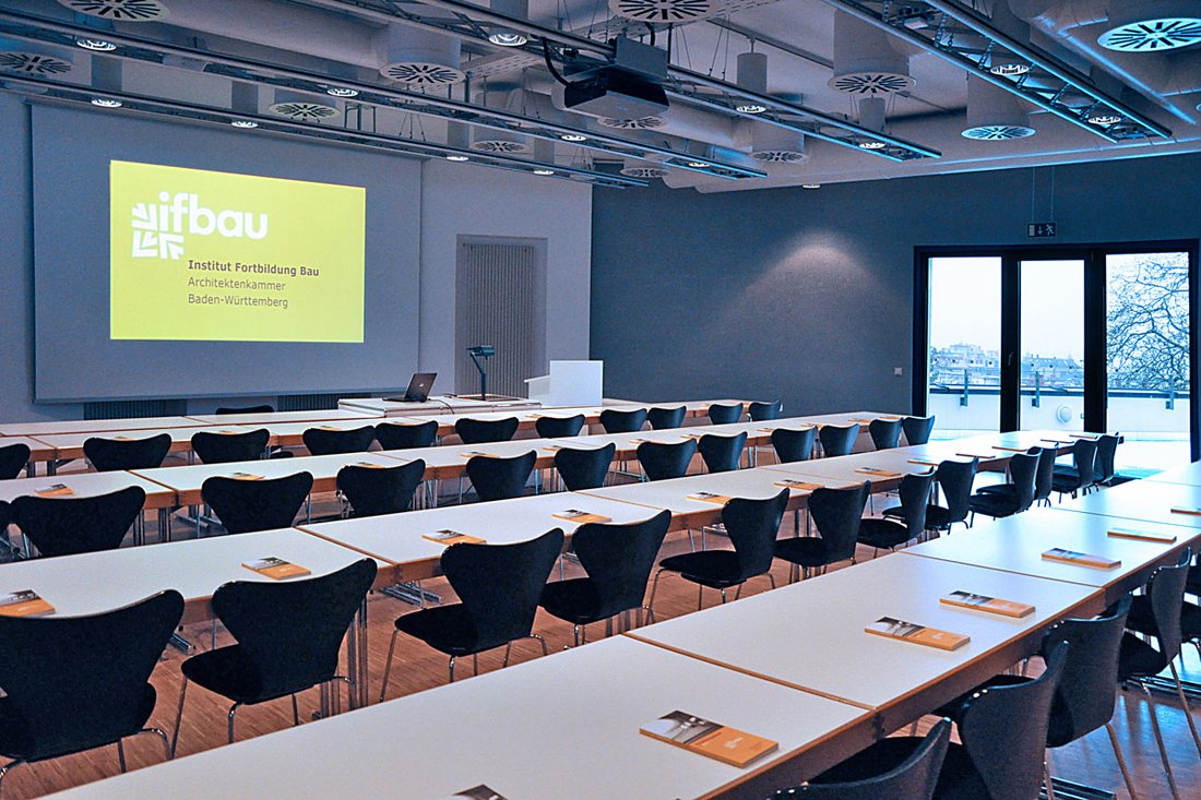 Der Saal Behnisch eignet sich hervorragend für Vorträge und Seminare mit bis zu 70 Personen. Bei Bedarf kann moderne Konferenz-, Video- und Audiotechnik zur Verfügung gestellt werden. Das angrenzende Foyer und die Dachterrasse bilden einen idealen Rahmen für Verköstigungen und Pausengespräche.