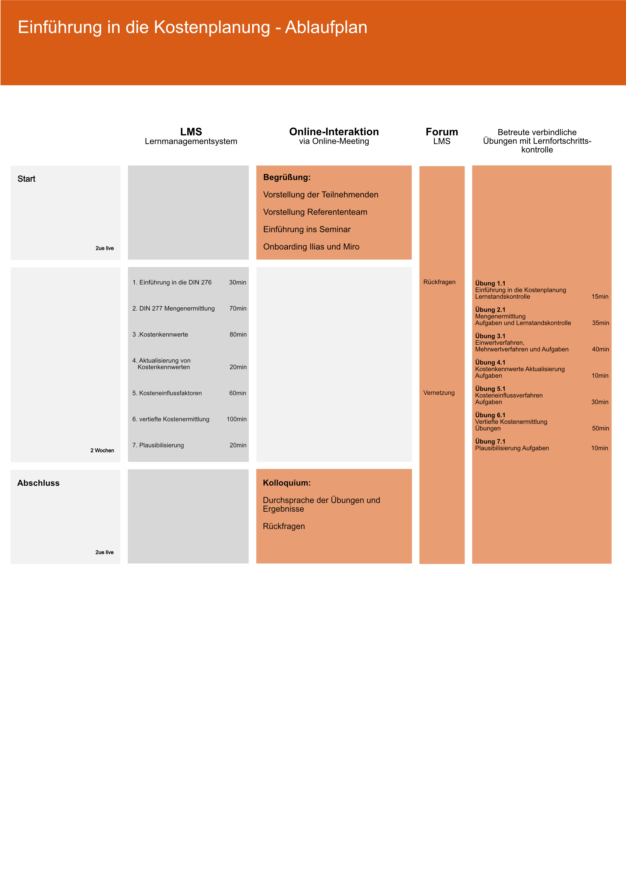 Mit einem digitalen Lernmanagementsystem können Sie zeitlich und örtlich unabhängig lernen und durch interaktive Lernfortschrittskontrolle und Livesessions Ihr neues Wissen praxisnah anwenden und überprüfen. Ziel des Seminars ist es, einen guten Einstieg in die Methodik und Anwendung der Kostenermittlung zu erhalten, Risiken und Einflussfaktoren zu berücksichtigen und die Ergebnisse zu plausibilisieren.