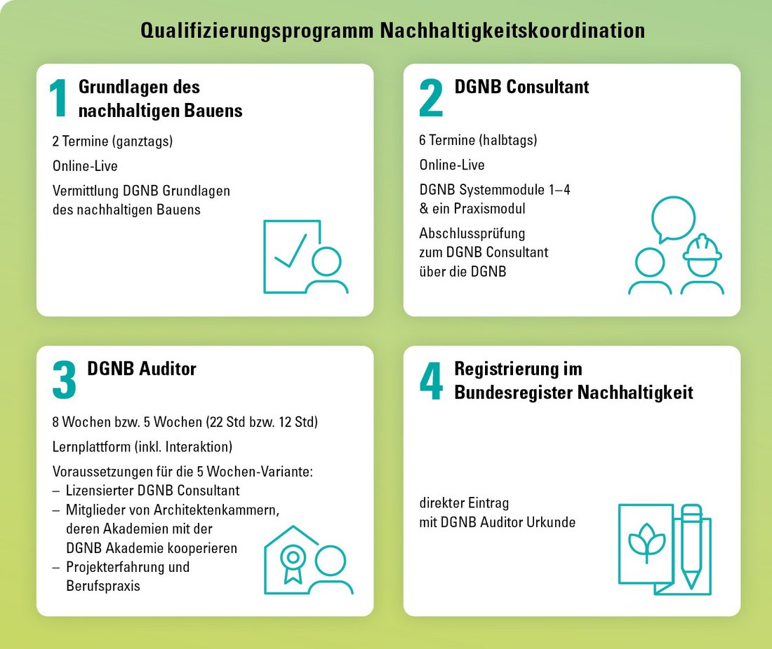Zur optimalen Vorbereitung auf das Bundesregister Nachhaltigkeit wie den Leistungsnachweis „Nachhaltigkeitskoordination“ bietet das Institut Fortbildung Bau der Architektenkammer Baden-Württemberg mit der Akademie der Architektenkammer Nordrhein-Westfalen und der Akademie der Architekten- und Stadtplanerkammer Hessen sowie der DGNB Akademie ein umfassendes und regelmäßiges Fortbildungsprogramm in Kooperation an.
