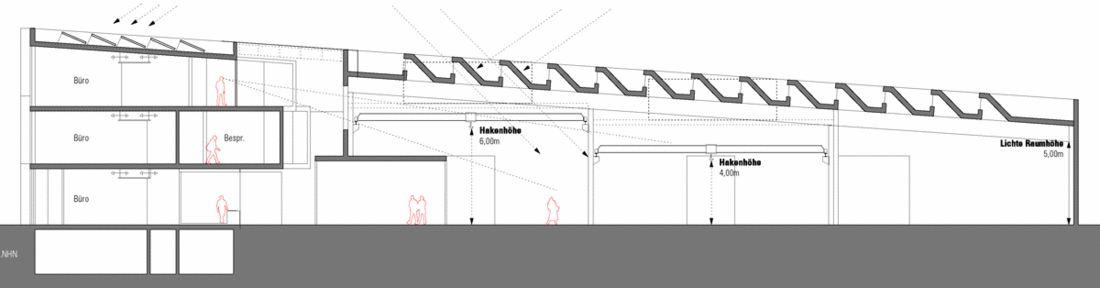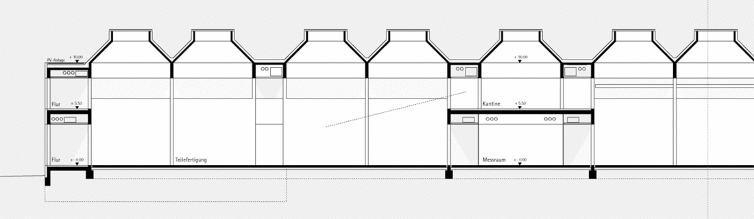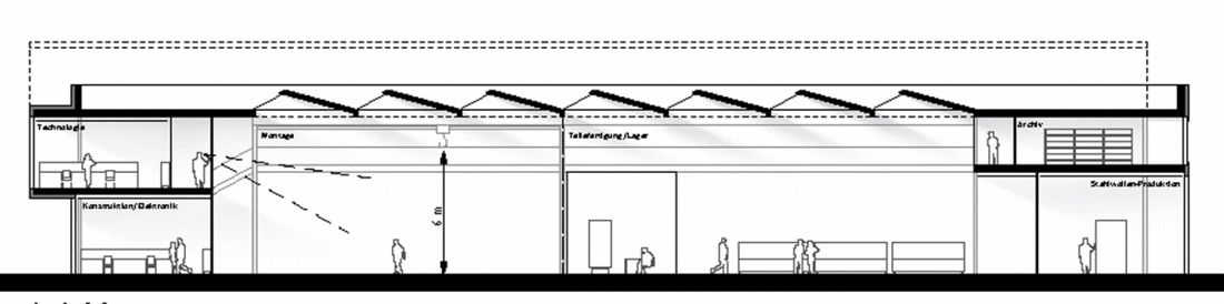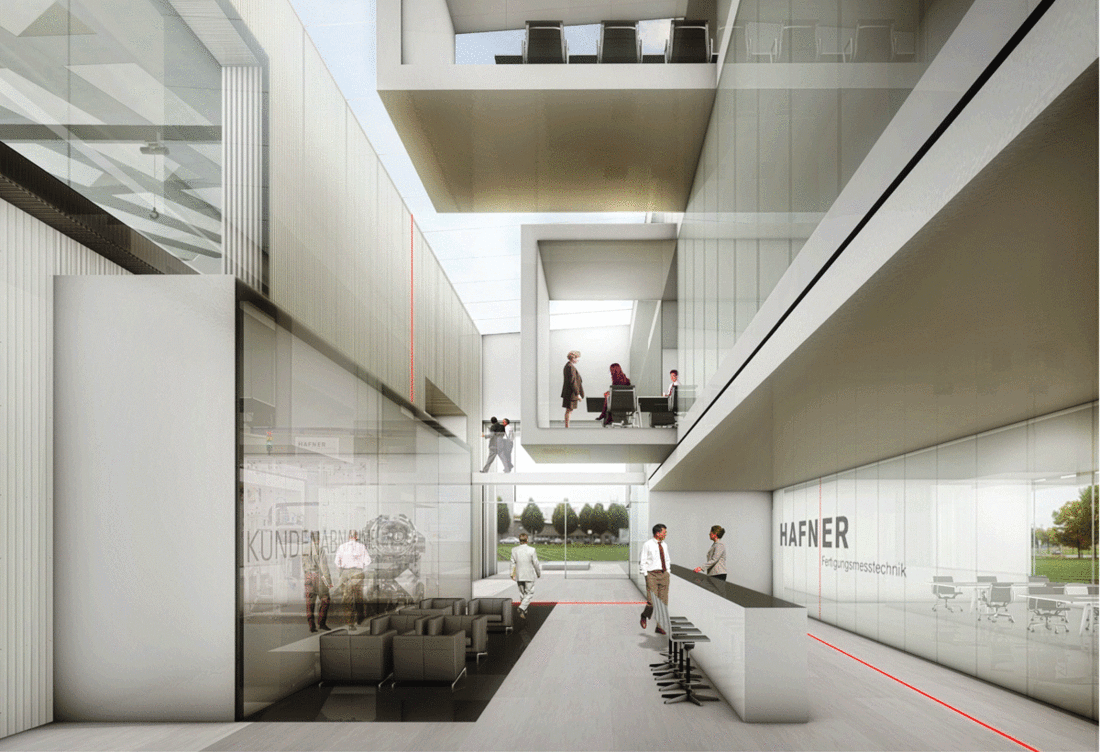 Die Freistellung des Gebäudes von der Nord-West-Ecke wird einerseits begrüßt, bringt aber auf der Südseite den Nachteil mit sich, dass zuwenig Platz für die Zufahrt bleibt. Die Nordseite sollte von einer Umfahrung frei bleiben. Die Einbettung der Parkierungsflächen in den Freiraum ist gut gelöst. Die Grundform des Keils geht gut auf die unterschiedlichen Raumhöhenanforderungen ein und schafft gleichzeitig ein markantes Erscheinungsbild. Positiv wird die Anordnung der Magistrale mit den beiden Zugangsmöglichkeiten für Mitarbeiter und Gäste gewertet. Der entstehende Zwischenraum ermöglicht wichtige Orte der informellen Kommunikation. Zusätzlich sollten die Sichtbeziehungen zu der Produktion erhöht werden. Die Fassadenzeichnungen und die Visualisierung lassen noch viele Fragen in Hinblick auf die konkrete Anmutung offen. Die Lage der Kundenabnahmeboxen ist bestens gelöst. Die Belichtung durch die nach Norden ausgerichteten Oberlichtsheds verspricht eine gute Belichtung des Produktionsbereichs. Im Zuge der Realisierung des zweiten Bauabschnitts wird die Lage der Anlieferung und der Teilfertigung kritisiert. Das Gebäude verfügt über ein wirtschaftliches Konstruktionsraster. Alle Kennwerte liegen im guten Bereich. Alle vorgeschlagenen Systeme zur Energieeinsparung machen Sinn und sind im weiteren einer Kosten-Nutzung-Analyse zu unterziehen. Fazit: Insgesamt liefert die Arbeit in ihrer Kompaktheit und Klarheit einen interessanten Beitrag, welcher sich sehr gut mit dem Selbstverständnis der Familie Hafner deckt. Die Bereiche Konstruktion und Elektrik sind gut miteinander verbunden. Es sind relativ kurze Wege realisiert worden. Jedoch besteht eine Trennung zur Montage (da 1. OG und Kommunikationsgang). Zwar sind direkte Wege aus der Konstruktion und Elektrik in die Montage vorhanden, es stellt sich jedoch die Frage in wie fern der Durchgang den Verwaltungsteil vom Produktionsteil trennt. Die Montage ist sehr gut in die Produktionshalle integriert. Die Teilefertigung und das Lager müssten bei einer Realisierung sicher neu angeordnet werden. Dies scheint jedoch durch die Kubatur problemlos möglich. Ideal gelöst ist die Integration aus Empfangsbereich (mit Nähe zur Verwaltung) und den Abnahmeboxen. Durch eine Neuanordnung der Teilefertigung und des Lager ließe sich auch ein zweiter Bauabschnitt gut realisieren. Die Andienung ist derzeit noch nicht optimal gelöst. Eine entsprechende Optimierung scheint jedoch auch nicht zu schwierig.