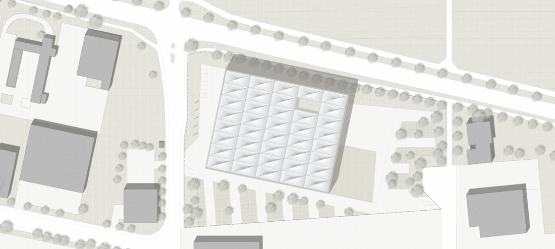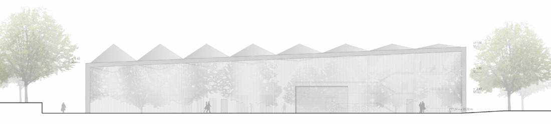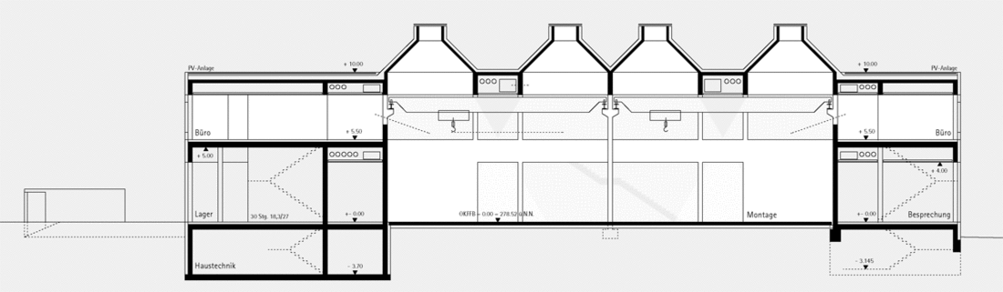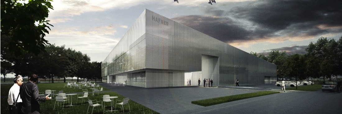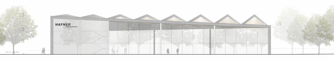 Bei dem Konzept handelt es sich um einen städtebaulich eigenständigen Baukörper mit solitärem Charakter, der zur Stauferstraße hin Ruhe & Präzision ausstrahlt, aber die zwingend notwendige freiräumliche Bearbeitung im Kreuzungsbereich nur unzureichend befolgt. Die Parkierung südlich des Neubaus ist folgerichtig und definiert den Zugang. Die architektonische Anmutung und Gestalt wird kontrovers diskutiert. Es bestehen Bedenken, ob das Selbstverständnis von HAFNER mit dieser Architektursprache einzulösen ist. Die subtile Analogie der Architekturelemente, die auf Industriebauten hinweist, wird gewürdigt. Festgestellt wird jedoch, dass diese bescheidene Gestik nicht identitätsprägend für HAFNER ist. Das Gebäude ist zweigeschossig organisiert. Das Herz des Baukörpers stellen die Hallenräume für Teilefertigung und Montage dar. Diese Hallenbereiche sind mit den für diesen Entwurf charakteristischen pyramidenförmigen Oberlichtern strukturiert. Die symmetrische Gliederung entspricht nicht den Raumprogrammflächen und funktionalen Anforderungen. Die Bürobereiche werden im Obergeschoss zu den Hallen flankierend zusammengefasst. Räumliche Nähe ist durch mehrere Treppenabgänge gut gelöst. Allerdings zwingt diese Positionierung Kunden und Besucher ins Obergeschoß, ein adäquater Empfang ist nicht gegeben. Abnahmeboxen im Erdgeschoß sind weder attraktiv noch funktional gut gelöst. Die Struktur des Gebäudes lässt eine Erweiterung zu. Die Raumhöhen der Hallen ermöglichen die benötigte Kranbahn. Die Qualität der Sozialbereiche entspricht nicht den Anforderungen. Die Hausmeisterwohnung ist unattraktiv und so nicht zu vertreten. Das Raumprogramm ist im Wesentlichen erfüllt. Lager und Montage sind etwas zu klein. Die strenge Rasterung bringt Zwänge und schränkt Flexibilität in der Innenraumgestaltung ein. Die Wirtschaftlichkeit des Entwurfs ist gegeben aufgrund der Kompaktheit und die Nachvollziehbarkeit des Tragwerks. Flächen für Technik sind gegeben. Die Architektursprache erfordert eine hohe Ausführungsqualität. Ein Energiekonzept liegt nur textlich vor, lässt sich jedoch im vorliegenden Konzept realisieren. Der Entwurf realisiert für die Bereiche der Konstruktion und Elektrik relativ kurz Wege, jedoch sind dies von der Montage durch ein Stockwerk getrennt (1. OG). Durch ein zentrales Treppenhaus ist der Zugang zur Montage jedoch relativ gut möglich. Die Teilefertigung sowie das Lager sind ebenfalls relativ gut gelungen, wenn auch hier Optimierungen im Teilefluss notwenig sind (zum Teil häufig kreuzende Wege). Die Abnahmeboxen sind zentral im Firmengebäude platziert und damit suboptimal gelöst. Nach einem ebenfalls eher ungeschickt gelösten Empfangsbereich ist der Kunde gezungen an der mechanischen Teileferitgung bis hin zu den Abnahmeboxen zu laufen (Stichwort: Geheimhaltung etc.). Ein zweiter Bauabschnitt scheint bei aktuellem Konzept relativ gut machbar, jedoch ist dies vermutlich der Grund, warum die weniger attraktive Teilefertigung in den vorderen Bereich der Produktionshalle (wo der Kunde die Halle betritt) gelegt wurde. Die Andienung wiederum ist relaltiv geschickt gelöst. Die LKWs können aus einem überdachten Bereich seitlich beladen werden.