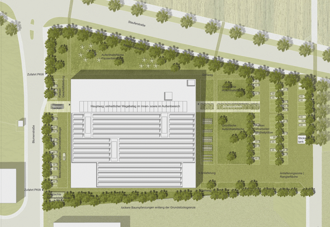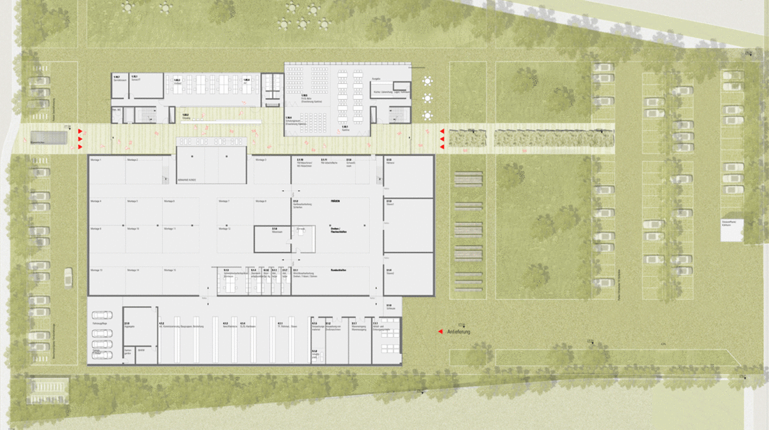 Der Entwurf besetzt das Baufeld entlang der heterogenen Bau-struktur der Stauferstrasse mit einer kompakten, parallelogrammförmigen Großform. Das Gebäude betont an der Nordwestecke den städtebaulich wichtigen Ort, was durch die Dreigeschossigkeit im westlichen Bereich weiter unterstützt wird. Im rückwärtigen, südlichen Bereich werden in sinnfälliger Anordnung die Parkierungsflächen plaziert. Die Anlieferfläche und der mögliche Erweiterungsraum befinden sich im Osten. Durch die grenznahe Bebauung und die Parallelität zu den Strassen bildet den Baukörper in angenehmer Weise die Grundstückskante ab, was eine eventuelle Einfriedung nicht erfordert. Das Gebäude öffnet sich mit dem Haupteingang und Vorplatz zur Blumenstrasse, der im Hinblick auf die zu erwartenden Verkehrsbewegungen ungünstig plaziert ist. Ein zu den Parkplätzen orientierter Nebeneingang begünstigt eine ungewollte Separierungder Zugänge. Die interne Organisation des Baukörpers weist sehr funktionale Strukturen auf. Im Zentrum befindet sich der Produktionsbereich, umbaut von den peripheren Funktionen sowie den produktionsorientierten Büroarbeitsplätzen und den Abnahmeboxen. Als ungünstig wird die Positionierung der Umkleideräume im Obergeschoss gesehen. Die Unterbringung der Archivflächen im Obergeschoss ermöglicht dem Verfasser den Verzicht auf eine Unterkellerung. Die äußere Erscheinung des Baukörpers als zwei ineinandergeschobene Volumen findet inhaltlich an vielen Stellen keine Entsprechung und erscheint fragwürdig. Die vorgeschlagene bauliche Erweiterung erfordert erhebliche baukonstruktive Eingriffe und ist im laufenden Betrieb nicht realisierbar. Die Sheddachkonstruktion über dem Produktionsbereich verläuft quer zur Hauptausrichtung und nutzt somit nicht die Synergien zur Konstruktion. Zudem endet das System ohne ersichtlichen Grund. Die Fassadengestaltung durch stark strukturierende, starre Horizontallamellen wird aus gestalterischen, energetischen und funktionaler Sicht kritisch gesehen. Der Vorschlag zeichnet sich im Hinblick auf die Fabrikplanung im Besonderen durch die gelungene Verbindung der Produktiven Bereiche aus. Die Wege zwischen mechanischer Konstruktion, Elektrik und Montage sind nahezu ideal (Dreiecksbeziehung). Eine ähnliche Situation ist zwischen Montage, Teilefertigung und Lager zu finden, für den Materialfluss bei der Entstehung einer Maschine vorteilhaft. Über die Abnahmeboxen im vorderen Bereich der Montage ist ein schöner Übergang vom Empfangsbereich (gut von der Verwaltung mit abzudecken) in die Produktion geschaffen. Ein zweiter Bauabschnitt ist rein von der Anordnung der Flächen gut gelöst, jedoch ist zu prüfen, ob dies auch durch die Außenhaut des Gebäudes vereinbar ist. Optimierungsbedarf besteht darüber hinaus sicherlich auch in der Andienung. Die wirtschaftlichen Kennwerte liegen im mittleren Bereich.