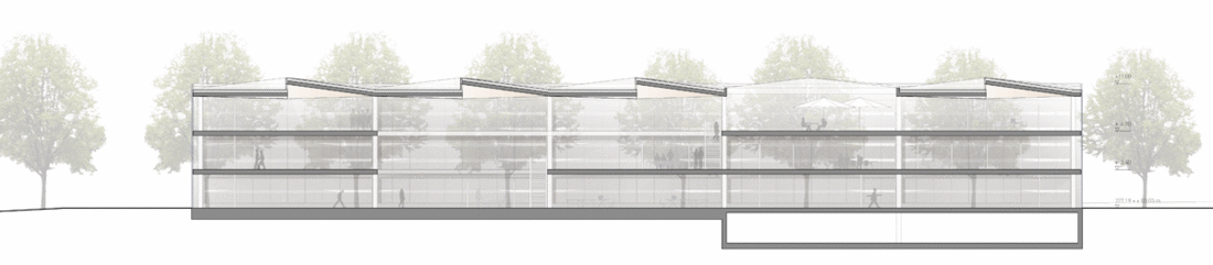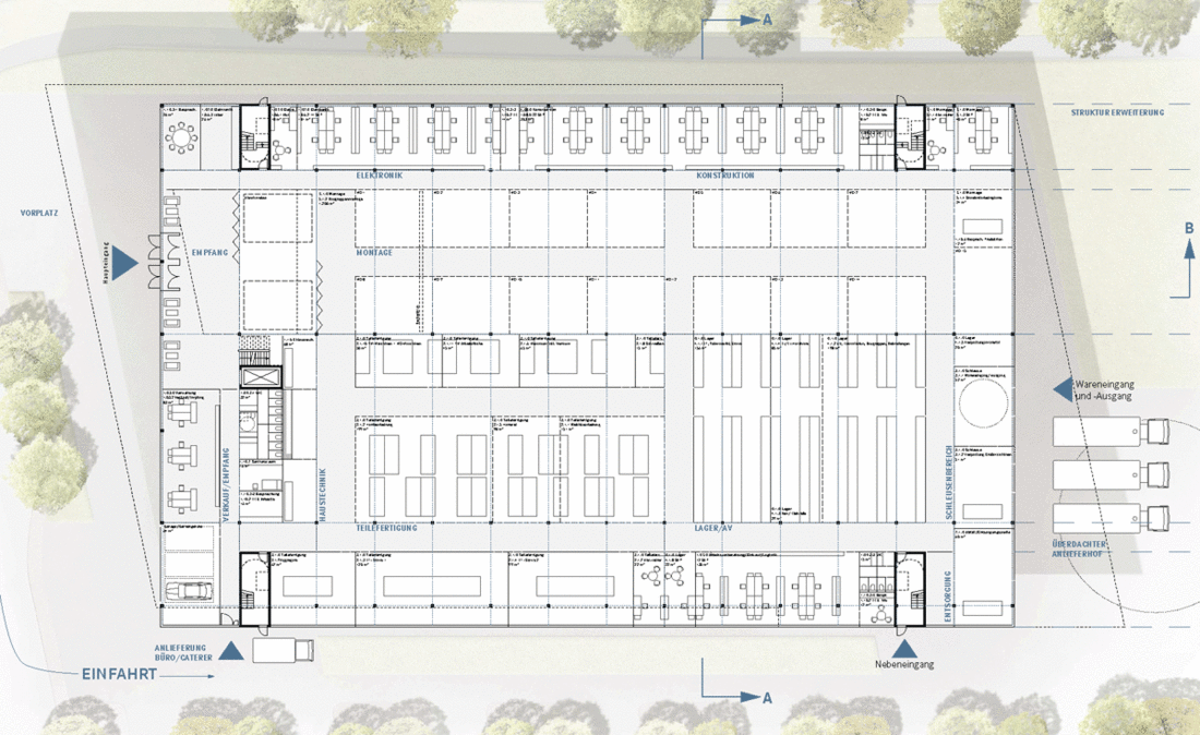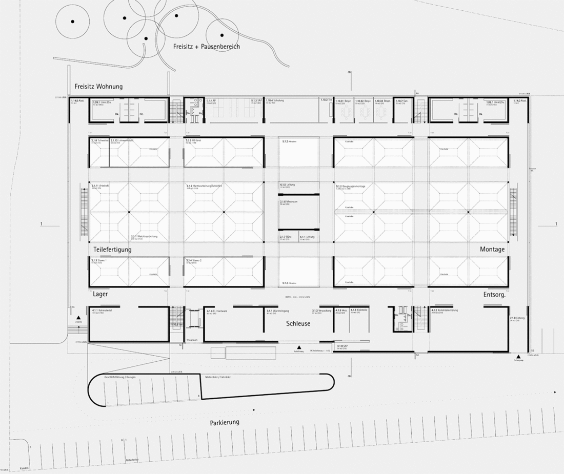 Der städtebauliche Ansatz besticht durch seinen klaren Baukörper. Zu der unhomogenen Umgebung am Rand des Gewerbegebietes kann so eine klare räumliche Grenze zum freien Landschaftsraum geschaffen werden, die "Visitenkarte" und "Adressbildung" des Unternehmens kann so gewährleistet werden. Der Baukörper baut seine Spannung durch die konstruktiven Elemente auf der Dachfläche aus und wird zum Alleinstellungsmerkmal des Entwurfs. Die in den Plänen aufgeteilten konstruktiven und klimatischen Funktionen sind allerdings nicht nachvollziehbar und müssten in einem weiteren Planungsschritt konkretisiert und entwickelt werden. Ebenso müsste die konstruktive Machbarkeit der Anschlüsse der Wände an die Dachfläche nachgewiesen werden. Unklar ist auch die technische Machbarkeit der Hausmeisterwohnung, sowie der dargestellten Räume im 2. Obergeschoss. Auf die entsprechende Rasterung, die den funktionalen Erfordernissen des Unternehmens genügen muss, wird noch einmal hingewiesen. Das Fassadenbild mit seinen transparent und transluzent gestalteten Glasflächen ist nochmals angepasst an die inneren Funktionen zu überarbeiten. Ebenfalls wird empfohlen, die funktionalen Abläufe nochmals zu überarbeiten. Der Eingangsbereich samt Treppenhaus kann zum Vorteil einer besseren sichtbar räumlichen Situation verschoben werden. Das Raumprogramm ist im wesentlichen erfüllt, funktionale Umschichtungen sind flexibel möglich. Der Wunsch des Unternehmens, die Räume im zweiten Obergeschoss anders anzuordnen, insbesondere die Verlegung der Hausmeisterwohnung und des Kantinenbereichs auch im Hinblick auf einen zweiten Bauabschnitt kann nur im Zusammenhangmit einer technisch machbaren Dachkonstruktion entsprochen werden. Ebenso sollte die Unterkellerung auch aus technischen Gründen ausschließlich unter dem Bürotrakt angeordnet werden, die Zufahrtssituation muss noch geklärt werden. Die Gestaltung des Außenbereichs kann durch den klar strukturierten Baukörper qualitativ hochwertig erfolgen. Die räumliche Situation für die Anlieferung kann auch im zweiten Bauabschnitt problemlos funktionieren. Zusammenfassend ist dieser Entwurf qualitativ sehr hochwertig, das Schlüsselthema bleibt aber die konstruktive Lösung der Dachfläche. Die Wirtschaftlichkeit des Gebäudes wird entscheidend durch die Konstruktion des Daches geprägt. Der Entwurf ist im produktiven Bereich (KO, EL und MO) noch nicht optimal angeordnet. Dies kann jedoch "leicht" realisiert werden. Im Bereich der Montage, Teilefertigung und des Lagers ist bei einer Realisierung eine Neuanordnung der einzelnen Bereich in der Produktionshalle in Teilen sinnvoll. Dies scheint jedoch in der Struktur des Gebäudes gut möglich. Die Abnahmeboxen sind gut erreichbar. Zu Prüfen ist, ob an dieser Stelle die gewollte Offenheit nicht zu viel ist, da diese komplett von der Straße einsehbar ist (auch hier ist eine notwendige Anpassung wahrscheinlich).