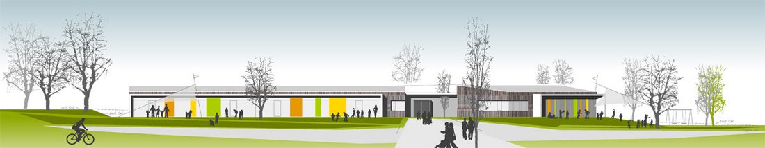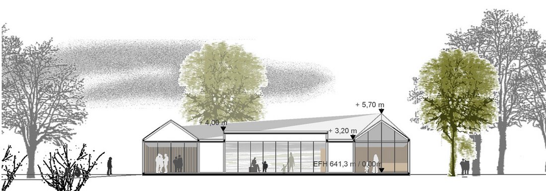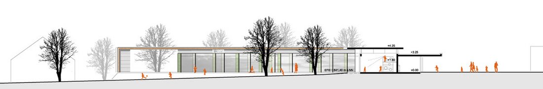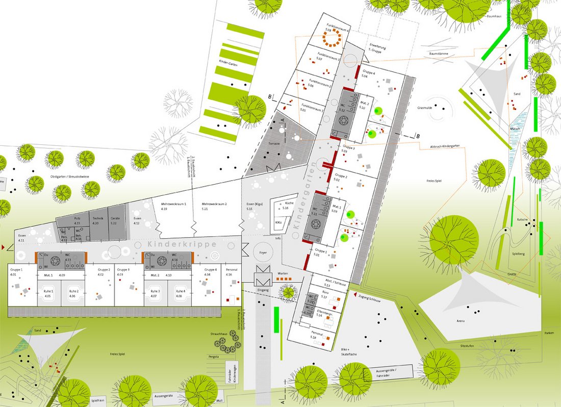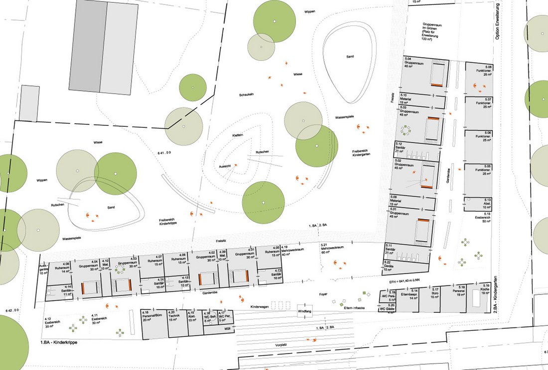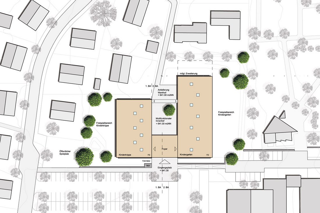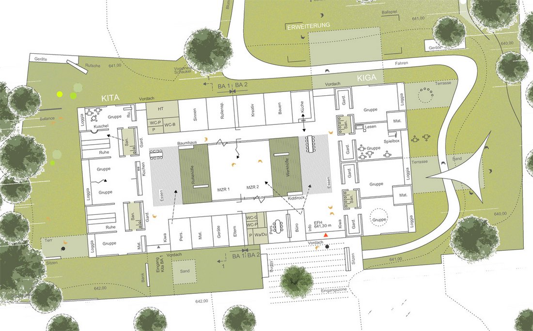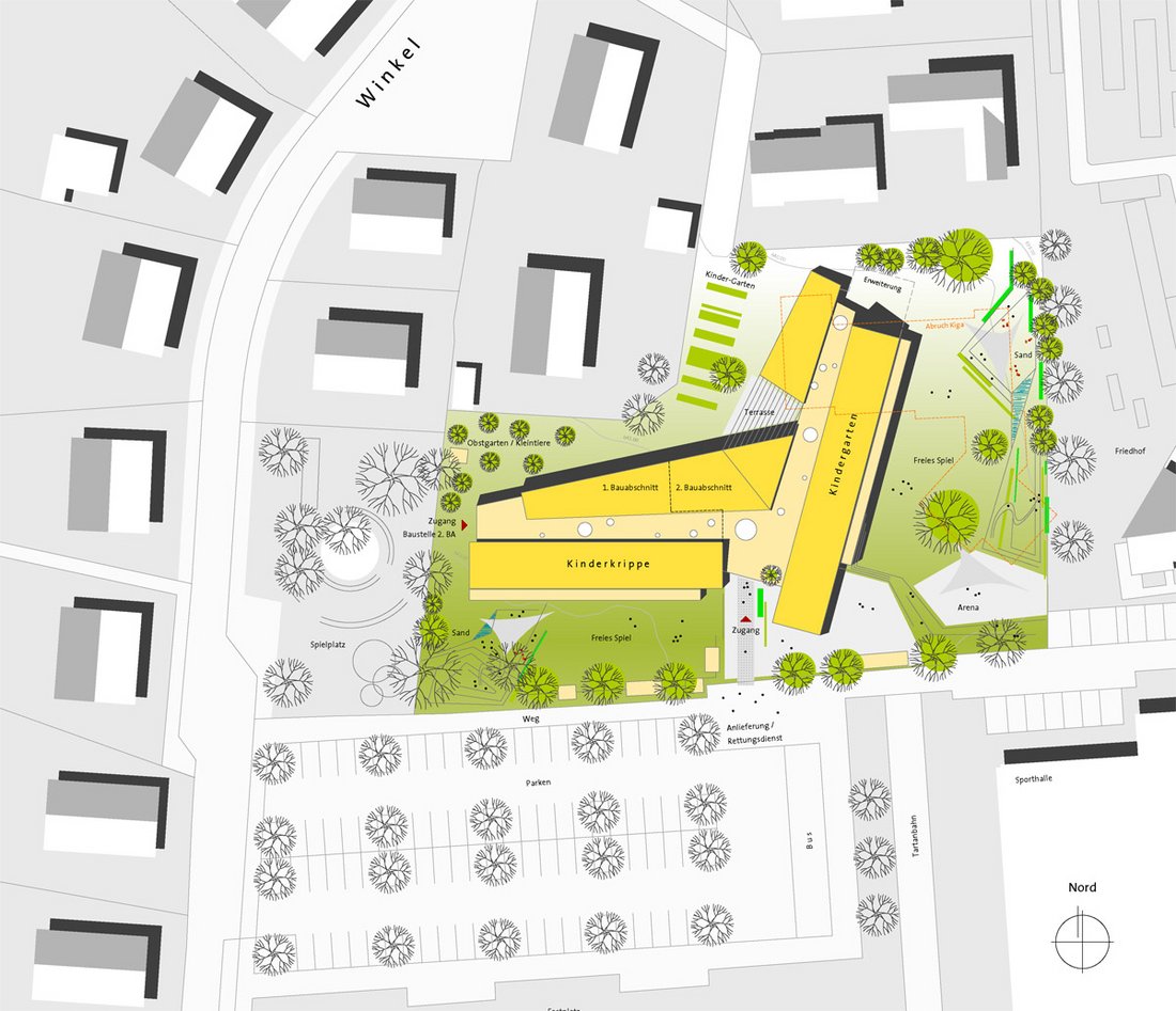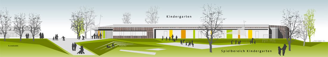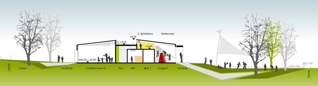 Beurteilung des Preisgerichts:Die Eingangsituation ist direkt geht durch das Gebäude durch und hat freie Sicht. Sie mündet straff im zentralen Gemeinschaftsbereich. Es gibt zwei große Grünbereiche im Süden und im Osten. Es gibt zwei klar strukturierte Baukörper. Die Räume sind offen, lichtdurchflutet und liegen an einer zentralen Mitte mit integrierter Küche, einem angebundenen Mehrzweckraum und einer Terrasse. Die Gruppen- und Funktionsräume sind klar strukturiert. Die gut positionierten Sanitärbereiche liegen funktional. Durch den abwechslungsreich gestalteten Flur entstehen Zonen mit hoher Aufenthaltsqualität. Die Gardaroben sind gut positioniert. Die Realisierung in Bauabschnitten ist gut möglich, insbesondere mit dem völlig getrennten Zugang am anderen Ende des zweiten Bauabschnittes. Die klare Trennung der Bauabschnitte ermöglicht einen guten Anschluss. Das Raumprogramm ist mit leichter Unter-schreitung der Flächen erfüllt. Alle Bereiche sind klar strukturiert und optimal durchdacht. In den Gruppenräumen des Kindergartens befindet sich auf dem Materiallager die Spielempore, die mit der natürlichen Belichtung des Oberlichts eine funktionale Bereicherung darstellt. Durch die kompakte Bauweise ist eine sehr wirtschaftliche Lösung möglich. Auf den Gruppenräumen und Nebenräumen sind leicht geneigte Satteldächer, der dahinter liegende Flurbereich mit Flachdach ist jedoch in der Ausführung etwas aufwändiger. Vorgefertigte Elemente sorgen für eine rationelle Bauweise. Die leicht geneigten Dächer eignen sich für eine Bestückung mit Photovoltaikanlagen. Das Besondere der Arbeit liegt in der guten Situierung des Gebäudes auf dem Grundstück und hat durch die Anordnung im Innern eine hohe Innenraumqualität.