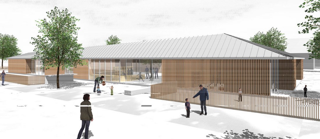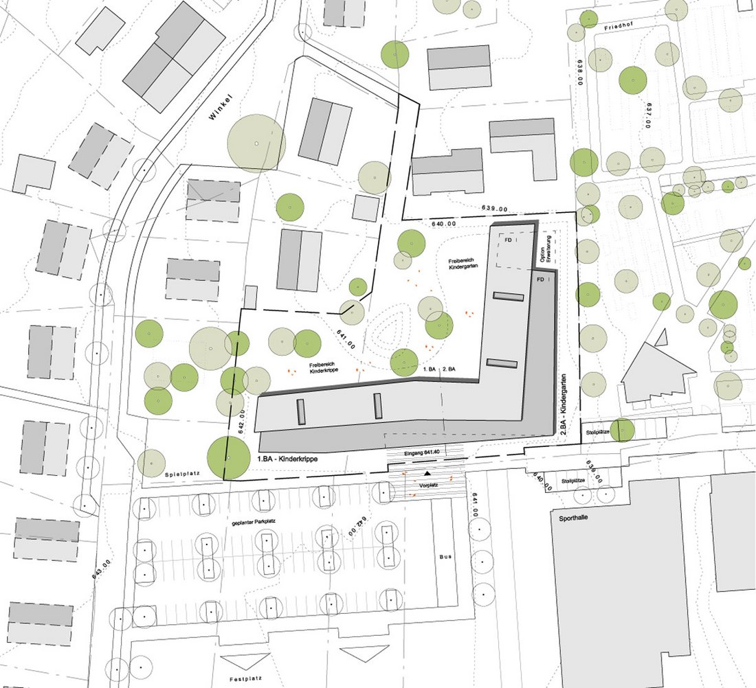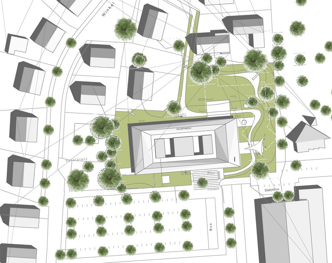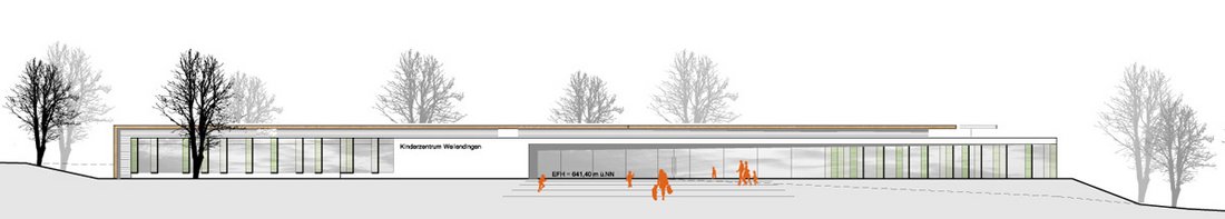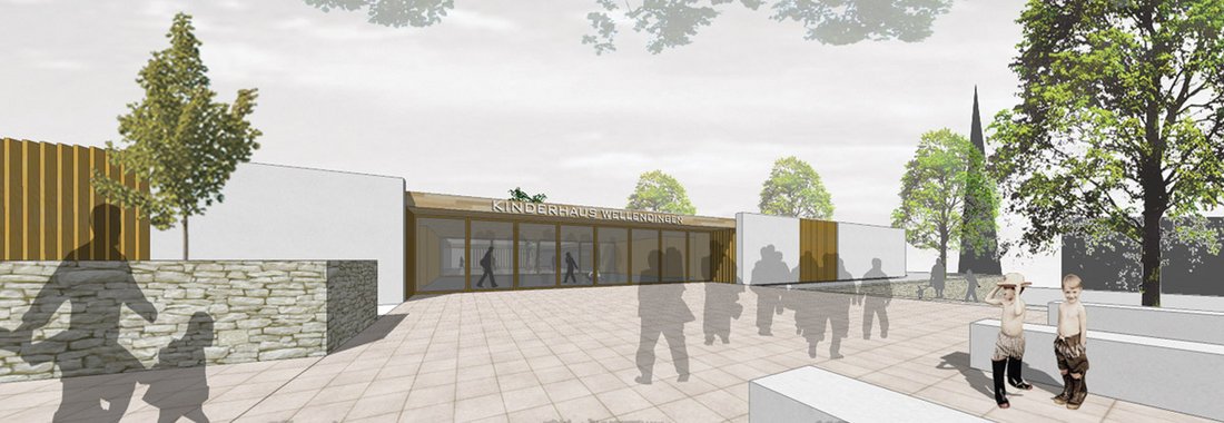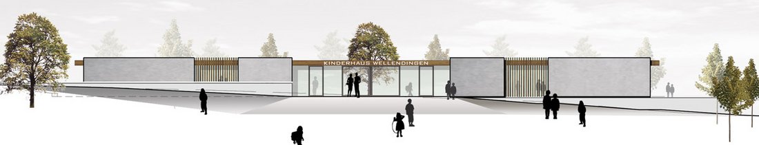 Beurteilung des Preisgerichts:Das Kinderzentrum Wellendingen wird im vorliegenden städtebaulichen Konzept am Verbindungsweg zwischen Rathausstraße und Straße Im Winkel bewusst angeordnet. Es steht in einer Reihe mit den öffentlichen Einrichtungen Schule und Friedhof. Durch die Konzentration des Grundrisses am Verbindungsweg entsteht im Inneren des U-förmigen Grund-risses des Kinderzentrums ein schöner Innenhof der beide Kindereinrichtungen verbindet. Kinderkrippe und Kindergarten wenden sich mit ihren Freibereichen und Gebäudeausrichtung nach Osten und Westen. Beide Grundrisse sind klar strukturiert in einzelne Nutzungszonen. Das besondere Potential entwickelt der Entwurf aus der Öffnung der Essensbereiche zum Innenhof. Dadurch entsteht eine Mitte zwischen den Einrichtungen, die flexibel nutzbar ist und vielfältige organisatorische Möglichkeiten eröffnet. Das Raumprogramm ist in allen Punkten gut erfüllt. Durch die Transparenz des Grundrisses nach Innen entstehen Nutzungsoptionen, die über das reine Raumprogramm hinausgehen. Die Bauabschnittsbildung ist gut eingehalten ohne dass zusätzliche verlorene Kosten entstehen. Das Materialkonzept beschränkt sich bei den Fassaden auf drei Materialien, Sichtbeton, Holz und Glas. Das große Flachdach wird sinnvollerweise als Gründach vorgeschlagen mit der Option, Sonnenkollektoren für die Brauchwassernutzung unterzubringen. In der Rangfolge der Arbeiten bei Programmfläche und Kubatur liegt der Entwurf im unteren Bereich, dadurch ist eine gute Wirtschaftlichkeit zu erwarten.