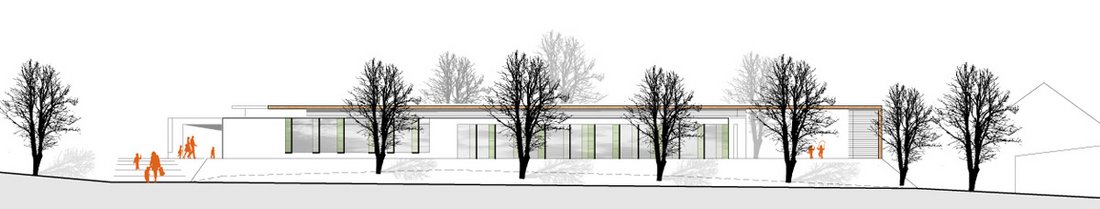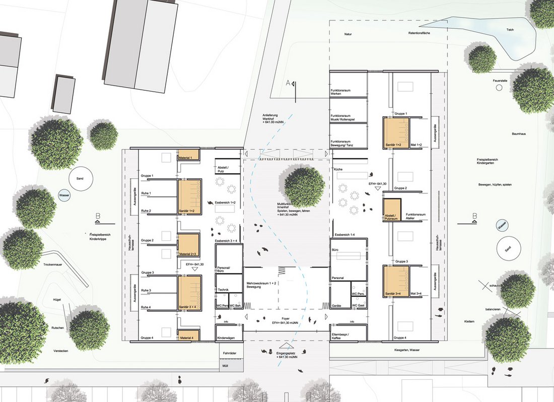 Beurteilung des Preisgerichts:Der ruhige, kompakte Baukörper gliedert das Baugrundstück in drei unterschiedlich große Freibereiche. Durch die eingeschossige Bauweise mit ruhigen Dachflächen wird trotz kompaktem Baukörper die Maßstäblichkeit gewahrt. Der Hauptzugang erfolgt gut auffindbar von der Rathausstraße. An den zentralen Lichthöfen im Gebäudekern bilden die zwei Mehrzweckräume zusammen mit den Essbereichen eine zentrale Mitte. Die Gruppenräume sind stirnseitig den Freiflächen im Osten und Westen zugeordnet, sind aber in ihrer Ausformung sehr schmal und tief. Die Erschließung der Funktionsräume ist gut gelöst und ohne lange, unbelichtete Stichflure. Der zweite Bauabschnitt bildet organisatorisch mit dem ersten Bauabschnitt eine klare Einheit, bedarf aber einer erheblichen Nachbearbeitung der gemeinsamen Gebäudeanschlussflächen im Wand- und Dachbereich. Das Raumprogramm ist erfüllt aber teilweise in den Flächen unterschritten. Durch die kompakte Bauform ist die Wirtschaftlichkeit gegeben. Sowohl die Grundrisse als auch die Fassaden sind klar gegliedert. Die Qualität des Wettbewerbbeitrags liegt in der straffen inneren Organisation, der kompakten Baumasse und den interessanten Innenhofbereichen.
