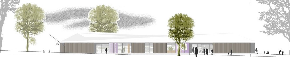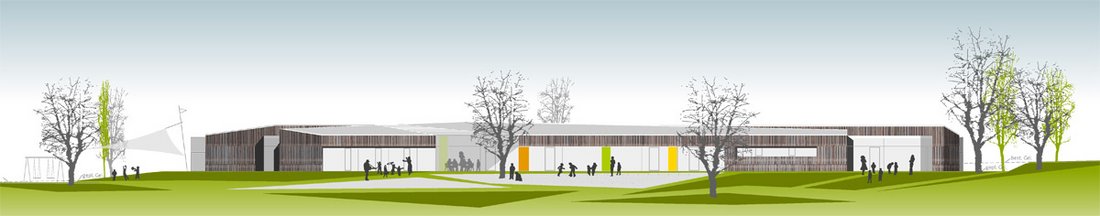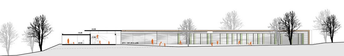 Beurteilung des Preisgerichts:Durch den kompakten, winkelförmigen Baukörper entsteht ein großer zusammenhängender Freibereich. Der Eingangsbereich, der als Überweg gestaltet ist, ist vom Parkplatz gut zu erreichen. Die zwei klar gegliederten Baukörper und die interessante Gestaltung der Wege ergeben viel Aufenthaltsqualität. Die offene Gestaltung des Mehrzweckraumes gegenüber dem Eingang ermöglicht eine sehr einladende Situation. Durch ein durchgehendes Oberlichtband wird eine gute Belichtung der Gruppenräume gewährleistet. Die Anordnung der Funktionsräume gegenüber den Gruppenräumen ist optimal und praktisch. Durch einfache Schnittstellen ist die Realisierung in Bauabschnitten gut möglich. Die Erfüllung des Raumprogramms wurde exakt eingehalten. Die schlichte, gut organisierte Ausführung beinhaltet trotzdem abwechslungsreiche Momente. Die kompakte Bauweise ermöglicht eine wirtschaftliche Lösung. Die Holzständerbauweise und Vorfertigung der Elemente unterstützen dies. Der Wettbewerbsentwurf erreicht mit wenig Gestaltungselementen ein Optimum für die Kinder. Der Entwurf besticht durch großen Freiraum und eindeutige Gebäudesituation. Das Raumprogramm wird durch eine leicht poetische Flurzone aufgewertet. Die Arbeit besticht mit wenig Mitteln zu einer Besonderheit.