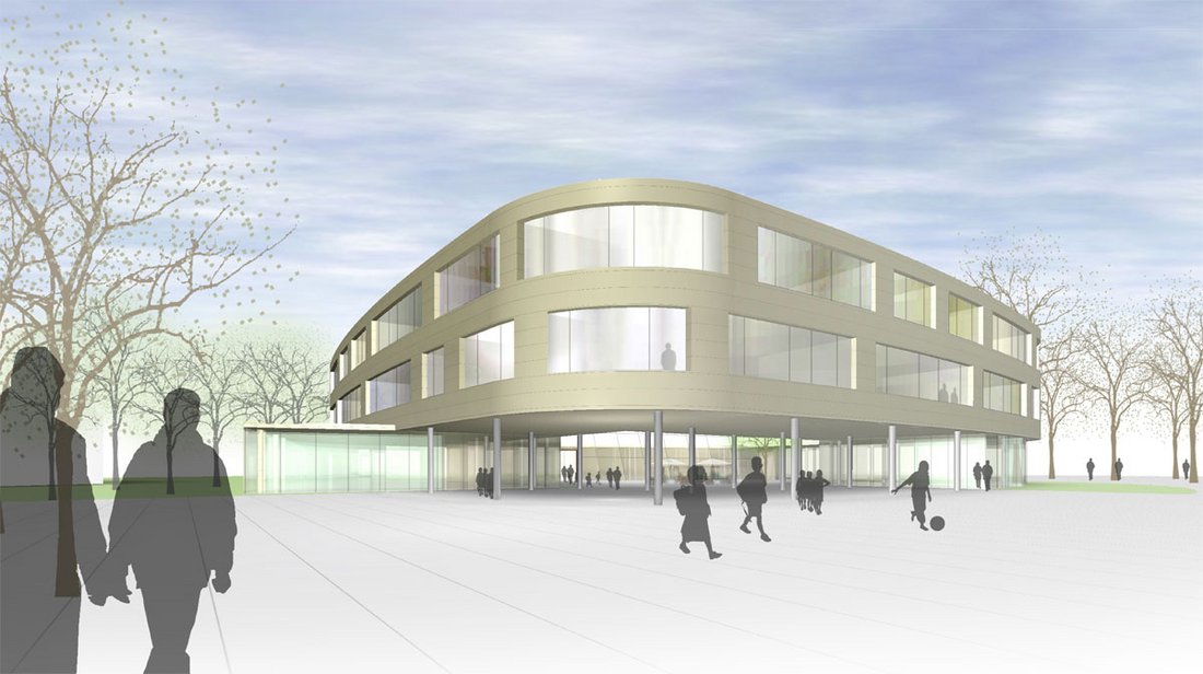 Städtebaulich wird der im Prinzip bereits bestehende Freiraum, der zurzeit mit Parkierungsflächen belegt ist, beibehalten und in eine großzügige Grünfläche umgewandelt. Dieser „grüne Daumen“ erstreckt sich von den Sportflächen im Süden über den Laubachweg bis zum Beginn der Innenstadt. Die Verbindung zu den Schulen auf der anderen Seite der Rabenstrasse wird durch die zentrale Positionierung der Stadtbücherei gestärkt. Die Ausgestaltung und Nutzung des entstehenden Stadtraumes im Norden der Realschule bleibt ebenso ungeklärt wie der vorgeschlagene Standort des Jugendhauses. Das neue Schulgebäude ist gefühlvoll in den Schwerpunkt der Grünfläche gesetzt. Ein annäherndes Quadrat, mit abgerundeten Ecken ergibt eine Freiform, die sich zum einen harmonisch einfügt und zugleich geeignet ist den Abschluss als auch die Überleitung zwischen den neuen Platzräumen zu bilden. Der zentrale Eingang erschließt sich über einen offenen Innenhof im Zentrum des Gebäudes und bietet einen ruhigen und angemessenen Auftakt. Der Innenhof öffnet sich gleichsam zur Realschule und Gymnasium und bildet wie selbstverständlich den notwendigen überdachten Pausenbereich und verkürzt dadurch die Entfernung zu den Bestandsgebäuden. Alle Funktionen sind richtig und schlüssig gesetzt. Die Vorgaben der Auslobung wurden eingehalten. Die Verkehrswege erscheinen allerdings etwas knapp bemessen. Die ungünstige Anordnung der Stützen engt die Flurbreite noch zusätzlich ein und ist auch in den Klassenräumen teilweise störend. Grundsätzlich positiv sind die Fluraufweitungen im Bereich der Klassenraumzugänge, wie auch die Grundrisse insgesamt mit hoher räumlicher Qualität gestaltet sind. Gewisse Nachteile für die Räume in den „Gebäudeecken“ ergeben sich aus der Form des Neubaus. Das vorgeschlagene Energiekonzept mit angenähertem Passivhausstandard, Lüftungsanlage mit hocheffizienter Wärmerückgewinnung und Betonkernaktivierung müsste in der weiteren Planung hinsichtlich Erstellungs- und Betriebskosten detaillierter untersucht werden. Die Berechnungen der Vorprüfung versprechen eine Realisierbarkeit im mittleren Kostenbereich. Die kompakte Gebäudeform, der moderate Fensteranteil sowie die vorgeschlagene Materialität versprechen günstige Betriebskosten. Die vorliegende Arbeit besticht im Realisierungsteil durch eine feinfühlige und gewissenhafte Ausarbeitung sowie einer hohen Funktionalität.