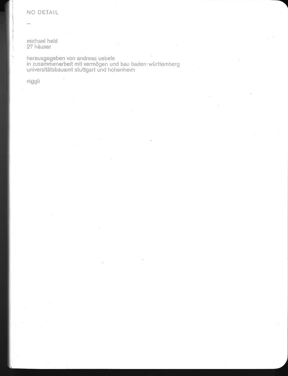 Held schrieb seine Gedanken in Tagebücher, die er mit Eintrittskarten, Zeitungsausrissen und Fundstücken aller Art collagierte. Dieses von seinem guten Freund, dem Grafiker Andreas Uebele konzipierte Gedenkbuch greift diese Textur auf und präsentiert 27 Bauten mit Fotos, Skizzen, Plänen und scheinbaren Materialproben wie ein abfotografiertes Arbeits-Musterbuch.Acht Texte von atelier 5, Werner Sobek, Arno Lederer, dem Vorgänger im Amt Klaus Schmidek, Andreas Uebele und Künstlern, die mit Held in Verbindung standen, schildern ihren Zugang zu dieser Persönlichkeit.