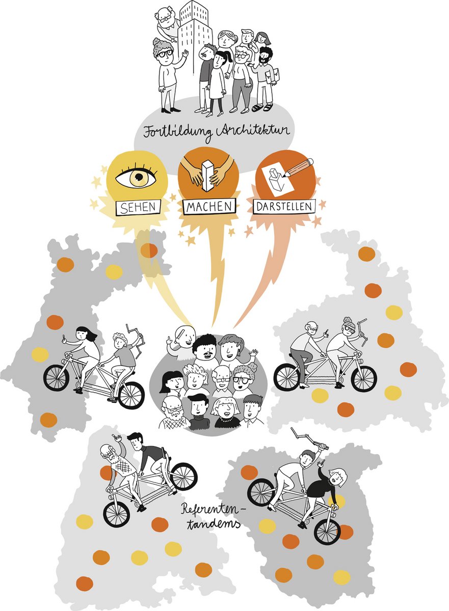 Diese elementaren Teilaspekte für baukulturelle Bildung wurden durch eine Projektgruppe konzipiert. Die Umsetzung in den Regierungspräsidien erfolgt durch vier langfristig miteinander arbeitende Referenten-Duos: jeweils eine kunstpädagogische Fachkraft für Fortbildung und ein Architekt oder eine Architektin, die in Baukulturvermittlung erfahren sind. Gemeinsam führen sie mehrere ganztägige Veranstaltungen zu jedem der Schwerpunktthemen an verschiedenen Orten durch, damit Interessenten ein Angebot in ihrer Nähe finden. Kernelement ist das direkte Erleben einer ausgewählten Architektur. So wird für die teilnehmenden Lehrerinnen und Lehrer baukulturelle Bildung konkret greifbar und damit auch die Umsetzung eines ähnlichen Projekts mit ihren Schülerinnen und Schülern.