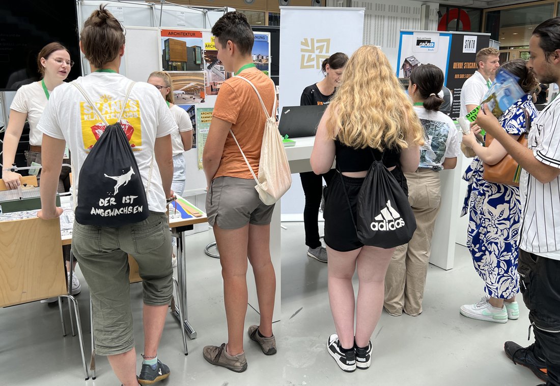 AKBW-Referentin Sophie Luz, die das Kammer-Kompetenzteam Nachhaltigkeit begleitet, konnte viele Ideen vermitteln, wie sich klimafreundliche Lösungen in den Planungsberufen umsetzen lassen. Ihr Fazit: "Super Austausch, richtig viele interessierte Schüler:innen und Studierende, auch Lehrer haben sich informieren lassen, war richtig gut."