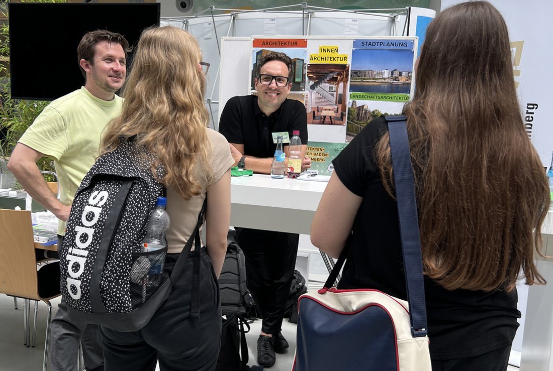 Der Ansturm auf den Stand der Architektenkammer war enorm. Vier ehrenamtliche AKBW-Mitglieder aus den Bereichen Stadtplanung, Architektur und Landschaftsarchitektur schilderten den interessierten Schüler:innen und Studierenden typische Arbeitstage, beschrieben Aufgabengebiete ihrer Fachrichtungen und gingen auf Fragen zum Studium ein. Hannes Bäuerle, Landschaftsarchitekt und AKBW-Landesvorstand machte keine Umschweife: „Auf was hast du Bock? Möchtest du eher im Bereich von Artenschutz tätig werden oder lieber kreativ planen?“