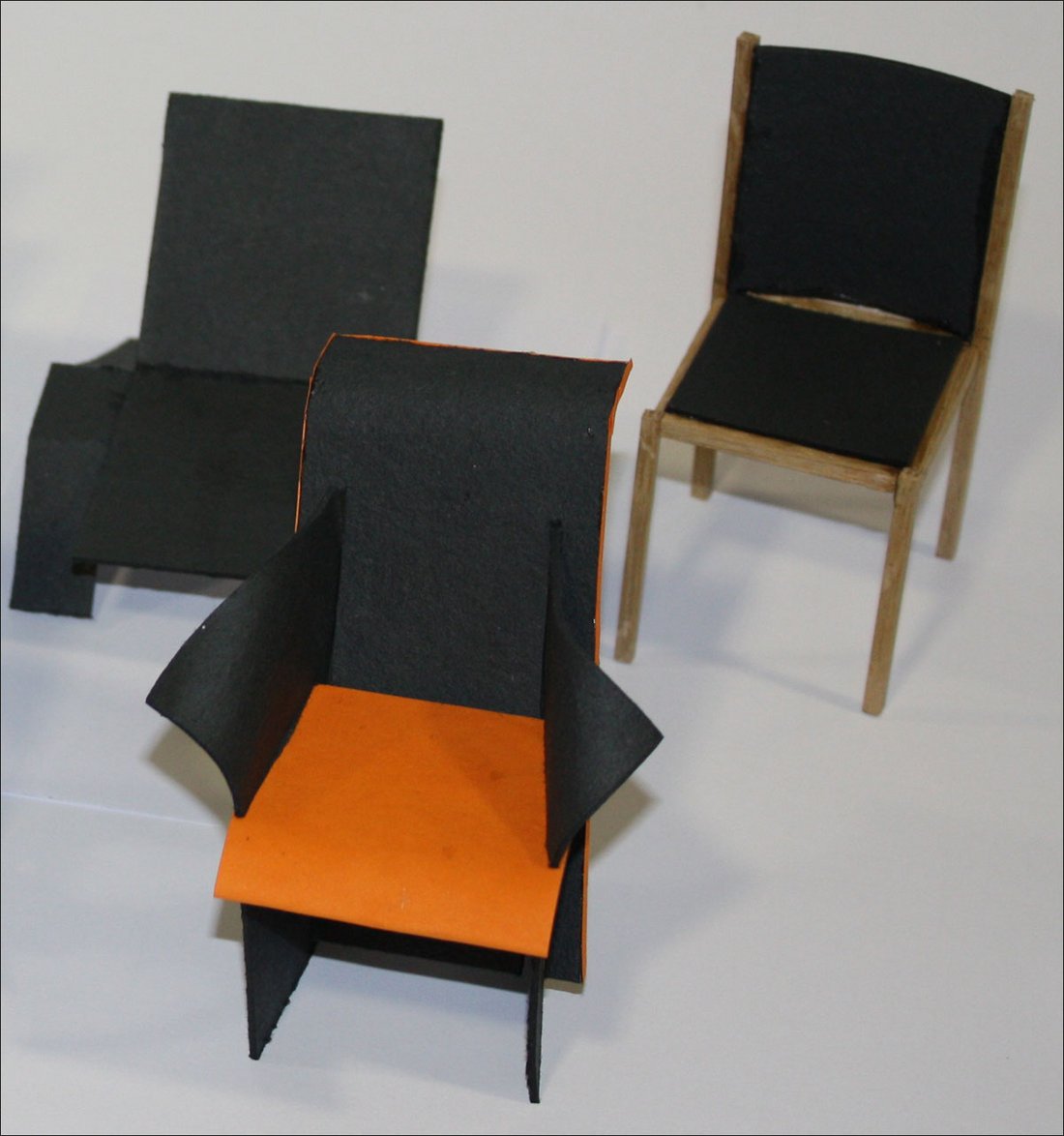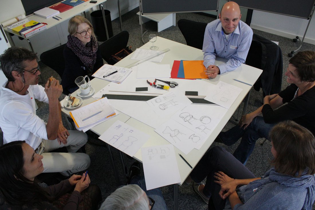 Ein weiterer Workshop beschäftigte sich mit Möbeln. Nach einer allgemeinen Einführung gab Architekt Markus Lägeler Einblick speziell in die Geschichte des Stuhls - "althochdeutsch stuol = Sitz, Thron" -, der "erst ab dem 18./19. Jahrhundert in weiten Bevölkerungskreisen zum Normalfall" wurde. Dieses exemplarische Möbelstück spiegelte er in der Ideenwelt des Bauhauses, zu dessen Hauptzielen das "funktionale Gestalten" gehörte. Im praktischen Teil erstellten die Teilnehmerinnen und Teilnehmer eigene Sitzgelegenheiten im Maßstab 1:10.