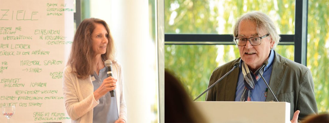 Geballte Erfahrung aus der Architekturvermittlung brachte Dr. Dr. Arne Winkelmann mit. Seit langen Jahren als Lehrerfortbilder, Kurator, Autor und Seminarleiter tätig, stellte er in seinem Vortrag Grundstrukturen einer Projektarbeit vor, nämlich Rezeption - Reflexion - Produktion - Präsentation, und ließ sie als Workshop-Moderator mit Leben füllen. Am Beispiel Bauen mit Stroh sah das so aus: Bei der Rezeption wurde zunächst aufgenommen was das Material mit sich bringt, Eigenschaften wie Wärme, Pieksen und Geruch oder auch Nutzbereiche. Bei der Reflexion standen weitergehende Überlegungen zum Stroh im Vordergrund, darunter seine historische Bedeutung als Baumaterial. Aspekte der Produktion können die Erstellung eines Gewölbes aus Strohmatten sein oder die Armierung mit Hasendraht. Und schließlich wurde unter dem Stichwort Präsentation auch die Schaffung eines Sinnespfades vorgeschlagen.