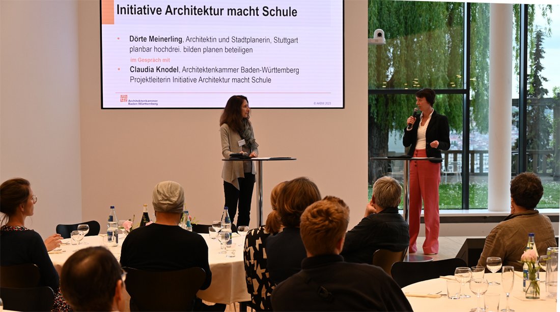 Das Abendprogramm fand im Haus der Architektinnen und Architekten statt, wo Dörte Meinerling (planbar hochdrei. bilden planen beteiligen) und Ulrich Schwille (AKBW-Landesvorstand) unter der Moderation von Projektleiterin Claudia Knodel Schlaglichter auf die AKBW-Initiative Architektur macht Schule warfen. Die Architekturvermittlung funktioniere am besten, wenn sie mit Möglichkeiten für Heranwachsende einherginge, selbst wirksam zu werden, analysierte die Partizipationsexpertin Dörte Meinerling und nannte als gelungenes Beispiel hierfür die Beteiligung von Jugendlichen an den Planungen für das Züblin Areal in Stuttgart.