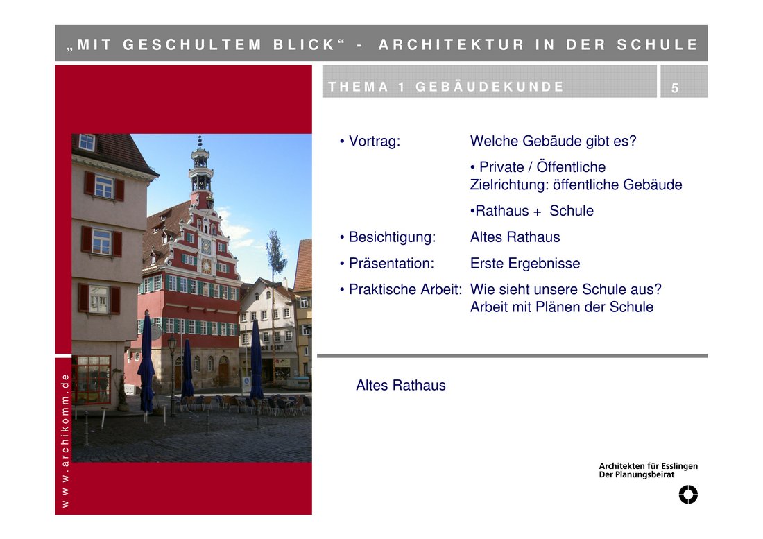 Aus Tübingen berichtete der Architekt Bruno Müller. Er ist seit rund zwei Jahren Mitglied des dortigen Arbeitskreises. 2005 gegründet hat sich die Gruppe zunächst theoretisch mit dem Bereich auseinandergesetzt und Themenvorschläge für den Unterricht entwickelt. Es folgten zahlreiche praktische Projekte an Schulen, flankiert von jährlichen Treffen mit Lehrern, um Kontakte zu pflegen und Erfahrungen auszutauschen. Zum Erfolgsrezept der Tübinger Gruppe gehörten darüber hinaus Fortbildungsveranstaltungen für Pädagogen und last not least das unermüdliche Engagement der Vorsitzenden Renate Bickelmann.