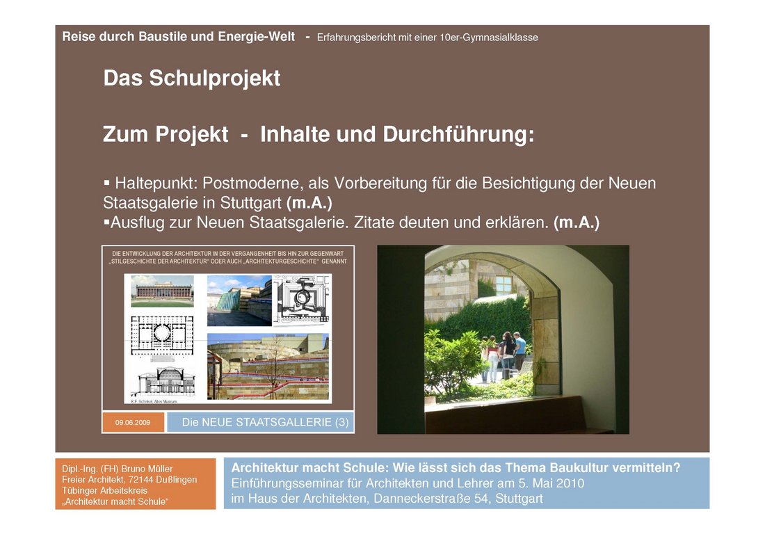 Bruno Müller berichtete von seinen eigenen praktischen Erfahrungen mit einer 10. Gymnasialklasse – auf Bitten einer Kunstlehrerin sollte er unter anderem einen Abriss der Architekturgeschichte geben. Erfrischend ehrlich sein Kommentar: "Bis auf wenige Ausnahmen waren Schüler für das Thema oder wie es angeboten wurde kaum zu begeistern."
