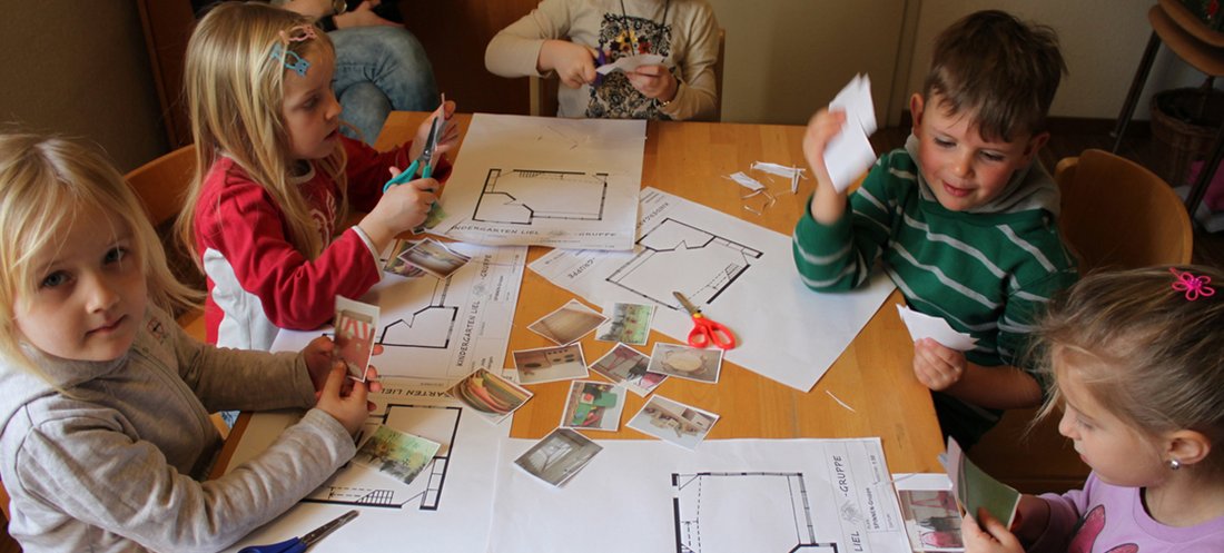 Architekturtage im KindergartenAn drei Vormittagen setzten sich die Schulanfänger im Kindergarten Liel mit ihrer täglichen Umgebung auseinander: Sie zeichneten Pläne von ihrem Kindergarten und bauten ihn als Modell nach.