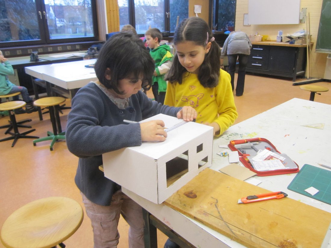 Das haben wir dann in einem Schuhkarton nachgebaut. Wir hatten großen Spaß, wie die großen Handwerker zu agieren! Wir haben Fenster und Türen eingebaut und Schränke gebastelt, Teppichböden verlegt, tapeziert und sogar Vorhänge geklebt. Mancher hat aus seinem Kinderzimmer ein Traumzimmer gemacht, andere haben akribisch die Pläne in ein Modell verwandelt.