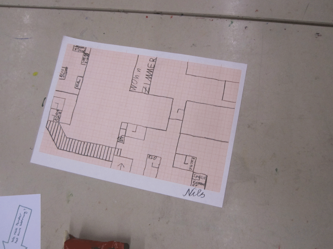 In verschiedenen gleich großen Kartons haben wir in kleinen Gruppen ausprobiert, was es heißt, ihn zu belichten und zu beleuchten - auf natürliche Art und Weise: wir haben Fenster eingebaut. Dann haben wir versucht unsere Wohnung, in der wir uns Tag täglich aufhalten, auf ein Stück Papier zu malen. Puh! Das war schwer. Wir kennen jeden Winkel und wissen genau wo welcher Schrank steht und dass die Tür nicht am Bett anstößt und dass eigentlich noch ganz schön viel Wand zwischen den beiden anderen Wänden sein müsste, aber so aus dem Kopf ... So machten wir es uns zur Aufgabe, bis zum nächsten Treffen unser Kinderzimmer auszumessen.