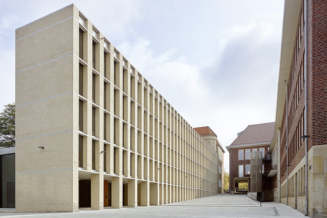 Der spektakuläre, anspruchsvoll gestaltete Erweiterungsbau des Philosophischen Seminars der Westfälischen Wilhelmsuniversität Münster von Peter Böhm Architekten aus Köln wurde von der sechsköpfigen Jury des Deutschen Ziegelpreises 2019 zum Hauptpreisgewinner für herausragende Architektur mit mehrschaligen Ziegelaußenwandkonstruktionen gekürt. Das bescheiden als "Regalwand" bezeichnete Bauwerk bezieht das denkmalgeschützte Bestandsgebäude geschickt mit ein und bildet eine attraktive Fassade gegenüber dem historischen Fürstenberghaus, dessen rote Klinkerfassade der Neubau – teilweise durch helle Schlämme verdeckt – aufnimmt. Im lichten, 4-geschossigen Foyer mit seinen zwei Himmelsleitern prägen die Ziegelpfeiler der Bibliothek mit den auf Lücke gemauerten, ebenfalls geschlämmten Ansichten das Bild dieser Halle. Hier wird der haptische Ziegel zum Synonym für sinnliche Ausstrahlung und geschickt reduzierte, ornamentale Anmutung. Peter Böhm freute sich über die öffentliche Wertschätzung seiner im wahrsten Sinne herausragenden Arbeit, die ihm im festlichen Rahmen der Preisverleihung überbracht wurde.
