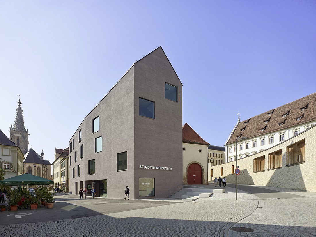 Joel Harris und Volker Kurrle nahmen als Hauptpreisträger für das Architekturbüro Harris + Kurrle aus Stuttgart die Keramikplakette, die Urkunde und das Preisgeld für die Stadtbibliothek in Rottenburg am Neckar entgegen. Die Jury – unter Vorsitz von Professor Dott. Piero Bruno – lobte die sensible Setzung des bemerkenswerten Neubaus als kommunikativem und kontemplativem Ort im Gefüge der Stadt. Der Spagat zwischen dem imposanten, benachbarten Bischöflichen Palais und der Kleinteiligkeit der mittelalterlichen Häuser ist mit diesem modernen Baustein sehr selbstbewusst gelungen. Die gestalterische Souveränität des markanten Bibliotheksbaus und seine Bedeutung als lebendiger Treffpunkt überzeugten die Jury. Sie beglückwünschte das Architekturbüro zur hohen Qualität dieses bis zu 5-geschossigen, schmalen Bauwerks, das den gekonnten, kreativen Umgang mit monolithischen Außenwandkonstruktionen aus hochwärmedämmenden Ziegeln bei diesem bemerkenswerten öffentlichen Gebäude unter Beweis stellt.