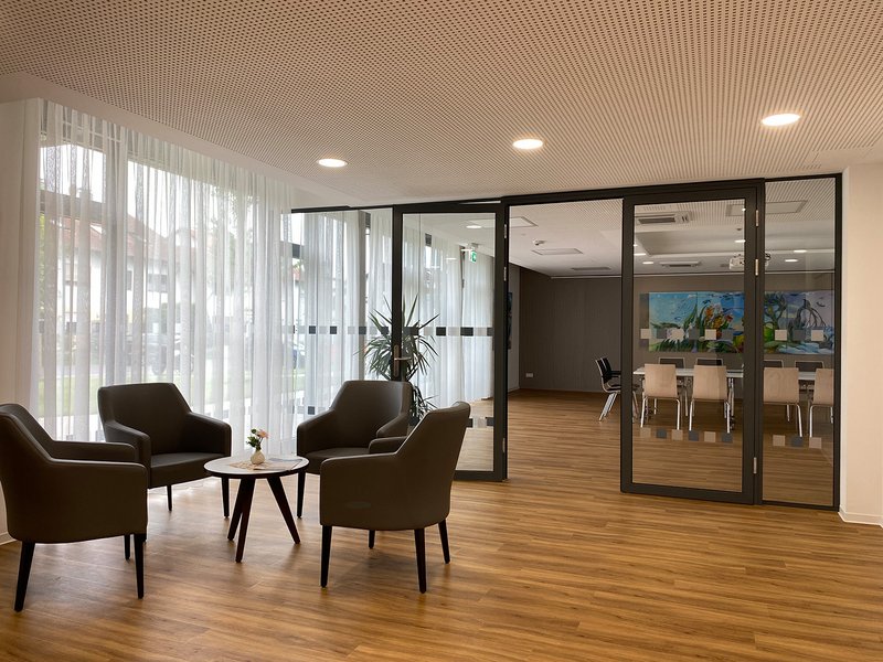 Direkt am Eingangsbereich des Hauses befindet sich ein Mehrzweckraum mit eigener Küche und einem kleinen Foyer. Diese Raumgruppe soll Möglichkeiten der Begegnung schaffen, und auch von externen Nutzern reserviert werden können. Natürlich wird das Haus selbst diesen Raum für Feste, Begegnungen oder kleine kulinarische Angebote nutzen können.
