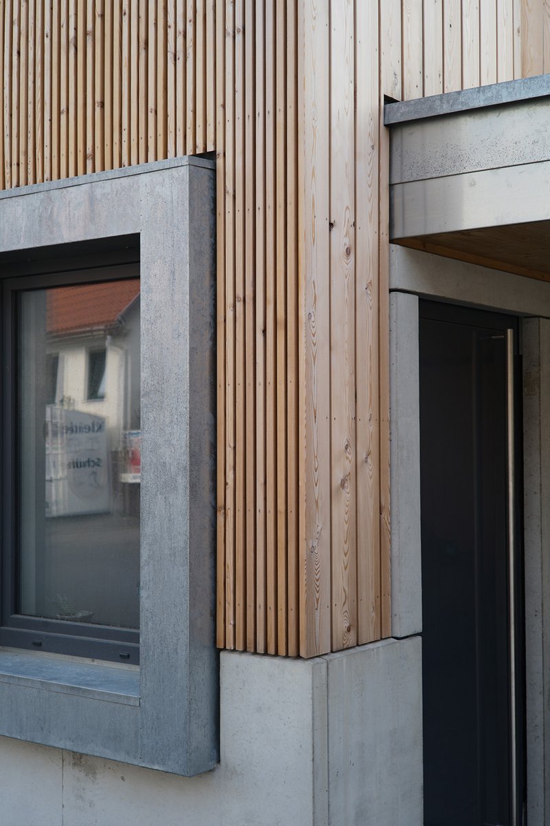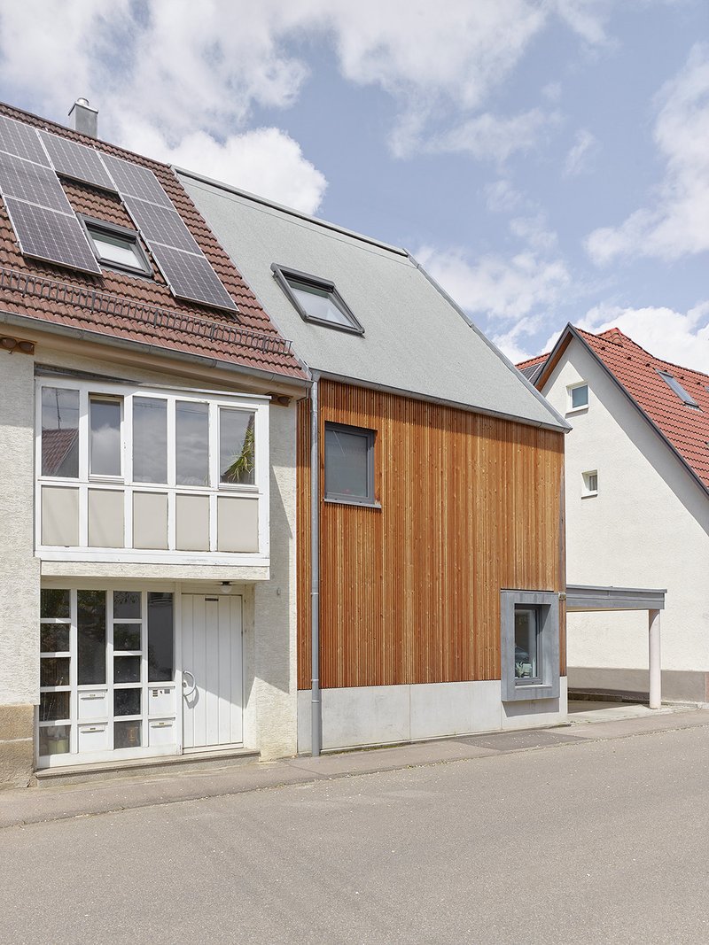 Eine an ein Haus aus dem 19. Jahrhundert angebaute Holzscheue sollte zu einem Einfamilienhaus umgebaut werden, jedoch ließen weder die Qualität der Substanz noch die räumlichen Gegebenheiten dies sinnvoll und wirtschaftlich zu. Schließlich entschieden wir uns gemeinsam mit der Bauherrschaft für die Planung eines Ersatzes der Scheune durch einen zeitgemäßen, nicht unterkellerten Neubau im Ortskern von Reudern, einem Stadtteil von Nürtingen. Dieser sollte ebenfalls aus Holz gebaut sein und das ursprüngliche Ensemble wieder komplettieren. Die Linien von First, Traufe und Sockel wurden vom Bestandsgebäude aufgenommen und in neuer Materialität und Sprache fortgesetzt.