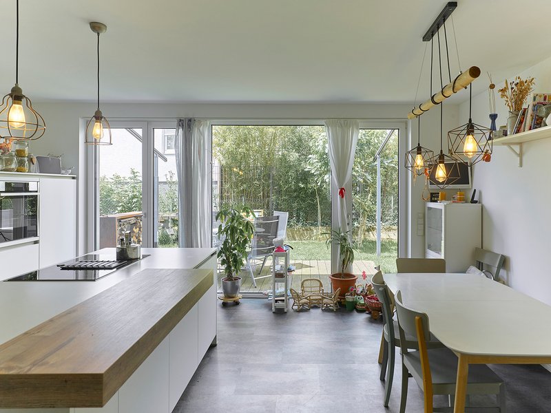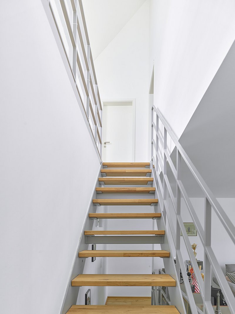 Die Innenräume sind mit Eiche-Parkettböden und glatt weißen Wand- und Deckenflächen einfach gehalten. Die Geschosse sind verbunden über Stahltreppen mit Eiche-Stufen. Bäder und Gästetoilette sind jeweils mit farbigen, kleinformatigen Feinsteinzeug-Fliesen und weißer Keramik ausgestattet, schlicht und dennoch effektvoll durch die einfarbigen Fliesen an Wänden und Böden. Besonders hervorzuheben ist die gute Zusammenarbeit mit der Bauherrschaft, die jederzeit aufgeschlossen und begeisterungsfähig für neue Lösungen war, von der Konzeption bis ins Detail.