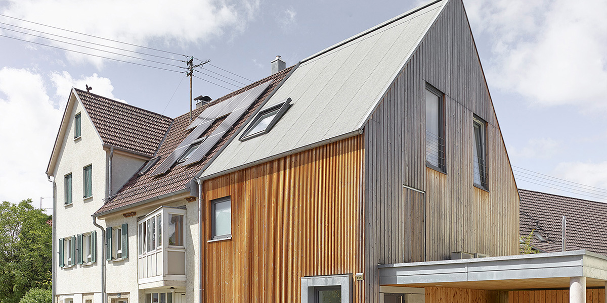 Fensteröffnungen werden an zwei wichtigen Punkten, dem Eingang und der geschossübergreifenden Verglasung zum Garten hin, mit hervorstehenden Blechbändern gerahmt, dafür bleiben manche Fenster hinter der Holzfassade nahezu unsichtbar. Das Satteldach wurde als hinterlüftetes Bitumen-Steildach ausgeführt, dessen Schieferoberfläche gut zu den bald vergrauten Holzoberflächen passen wird, sich dennoch gegenüber Bestand und Umgebung unaufdringlich unterscheidet. Blech- und Betonflächen für Fenstereinfassungen und Sockel ergänzen den aufeinander abgestimmten Materialkanon.