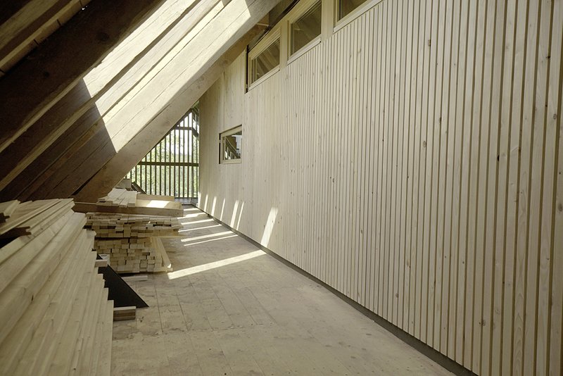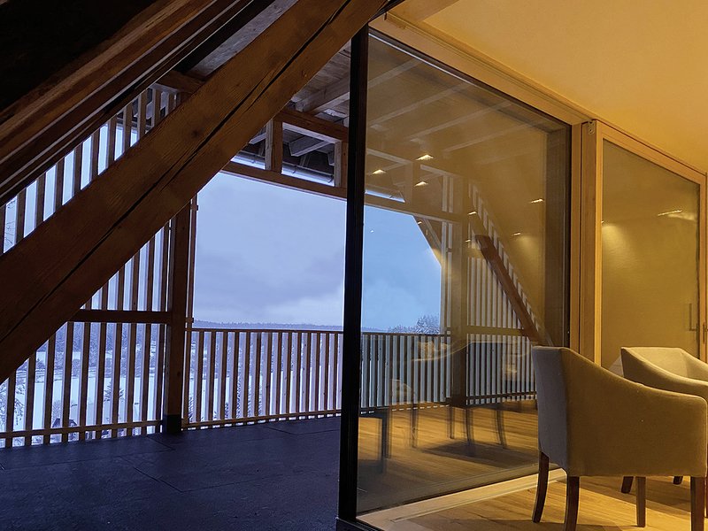 Diese Wohnbox auf einer Ebene umfasst eine eigenständige Wohneinheit für die Tochter, die später auch umgekehrt als „Leibgeding“ für den Hofbesitzer dienen kann, während die Tochter dann mit Familie die größere Wohnung darunter bezieht. Um die Tenne ausräumen zu können, musste als erste Maßnahme der vorhandene Pferdestall um ein Heulager erweitert werden.Die Wohnbox ist unter dem Hofdach witterungsgeschützt, die Außenwände und Decke sind gedämmt wie eine Außenhaut, da der Hofgiebel zugunsten der Belichtung und Belüftung offen gestaltet wird.Südseitig wurde die Box in die Dachebene hineingebaut und durch eine Gaube ergänzt, damit die beiden dort angeordneten Räume natürlich belichtet und belüftet werden können. Dreiseitig ist die Box von der Dachhaut so abgelöst, dass man zwischen Box und Sparren durchlaufen kann. Außerdem ergibt sich ein geschützter „Windfang“ zwischen neuer Giebeltorverglasung und Boxeingang, sowie eine geschützte Loggia auf der Hanggiebelseite mit toller Weitsicht in den Schwarzwald. Eine neue einfache Verglasung in Dachhautebene in der Traufseite garantiert die Belichtung der Nebenräume (WC, Bad + Hauswirtschaft) innerhalb der Box. Zum Giebel ist der große Wohn-/Essbereich mit offener Küche orientiert, so dass bei geöffneter Schiebetor der Wohnraum um die Loggia vergrößert wird.