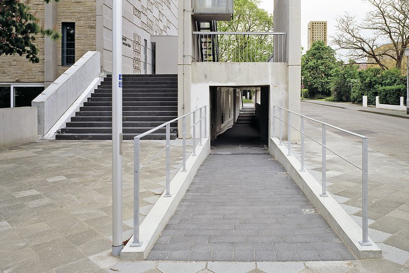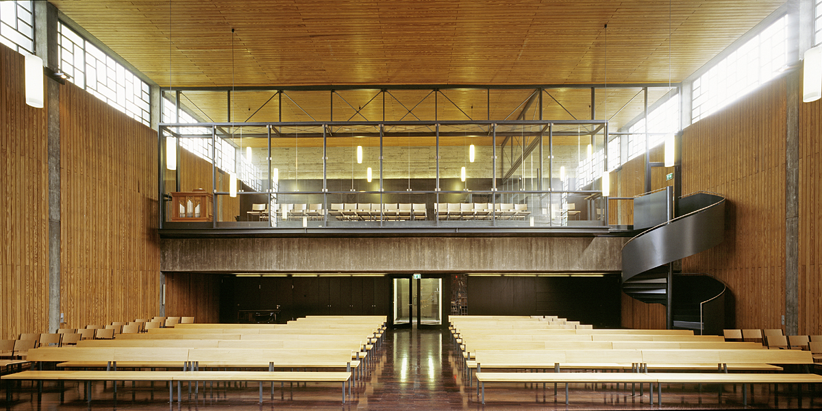 UmsetzungDas bestehende Kirchenhaus aus den 1960er Jahren wurde für eine zeitgemäße Gemeindenutzung umgebaut. Es wurde möglichst sensibel mit dem Bestand umgegangen und dennoch eine große Flexibilität für die Nutzer erreicht. Um zusätzliche Räume wie Pfarrbüro, Sekretariat, Besprechungs- und Lagerräume sowie sanitäre Anlagen unterzubringen, wurde das Volumen unter der bestehenden Eingangstreppe in das Entwurfskonzept integriert. Diese Räume sind über eine neu angelegte Passarelle, die durch den Glockenturm führt, barrierefrei erreichbar. Der bisherige Haupteingang der Kirche blieb erhalten. Unter der Empore wurde das Foyer mit Garderobe, Aufzug und Küche angeordnet. Über eine Durchreiche sind Küche und Kirchenraum verbunden. Die komplett verglaste Empore im Innern wurde erweitert und erhöht, so dass eine optimale Blickbeziehung zum Altar erreicht wird. Die Verglasung kann zum Kirchenraum hin geöffnet werden. Somit ist eine zusätzliche Nutzung als Gemeinderaum oder "Winterkirche" möglich.