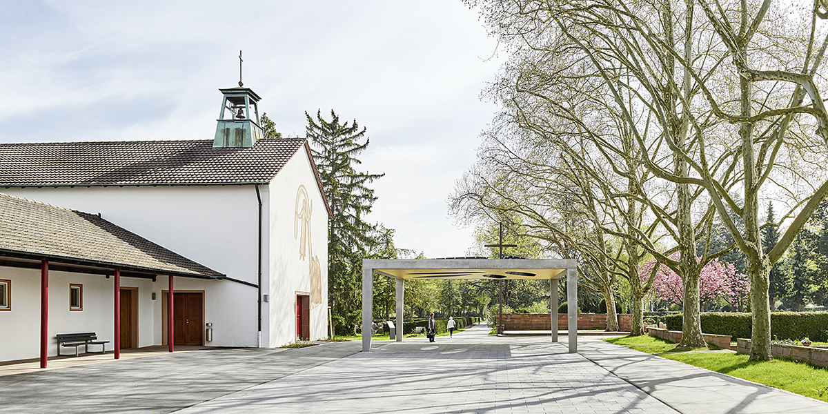 Der archaische Betontisch mit sich zum Boden verjüngenden Stützen, sorgt für einen wettergeschützten Stand im Außenbereich. Die in Gold eingefärbte Deckenuntersicht und die einem Ölzweig nachempfundenen Oberlichter verweisen auf die konfessionsübergreifende Nutzung. Ein ganz feines Kreuz wurde aus der großen Holztüre gesägt, die ins Freie führt. Durch das Kreuz hindurch leuchtet der Himmel in all seinen Facetten je nach Wetter. Man sieht im Kreuz und durch das Kreuz hindurch das „Oster“-Licht des Himmels. Das Licht bricht durch, so wie ER durch das finstere Tal des Todes durchgebrochen ist. Sarg und Trauergemeinde gehen durch das Kreuz ins Licht. Das leuchtende Kreuz ist eine stille und zugleich aufregende Botschaft für jede Trauerfeier, für jeden Trauernden, für jeden Abschied. Welch gewaltige Aussage: „Ich darf in tiefster Trauer Erleben, dass ER lebt, weil das Kreuz leer ist.“