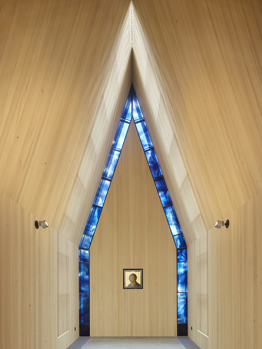 Der introvertierte Kapellenraum ist durch eine Vertäfelung aus gebürsteter Weißtanne sowie direkten und indirekten Belichtungselementen an Giebel und Seitenwänden von aufnehmender Freundlichkeit. Die besondere Dachform wirkt einerseits beschützend, andererseits befreiend. Die ohnehin ausdruckstarke Vertikalität wird durch blaue mundgeblasene Scheiben, welche die Gebäudeform nachzeichnen, verstärkt. Die Farbe Blau deuten wir als Farbe des Göttlichen, des Himmels, des Geistigen, unendlicher Weite, aber auch als Farbe für Introvertiertheit und Rückzug in sich selbst.
