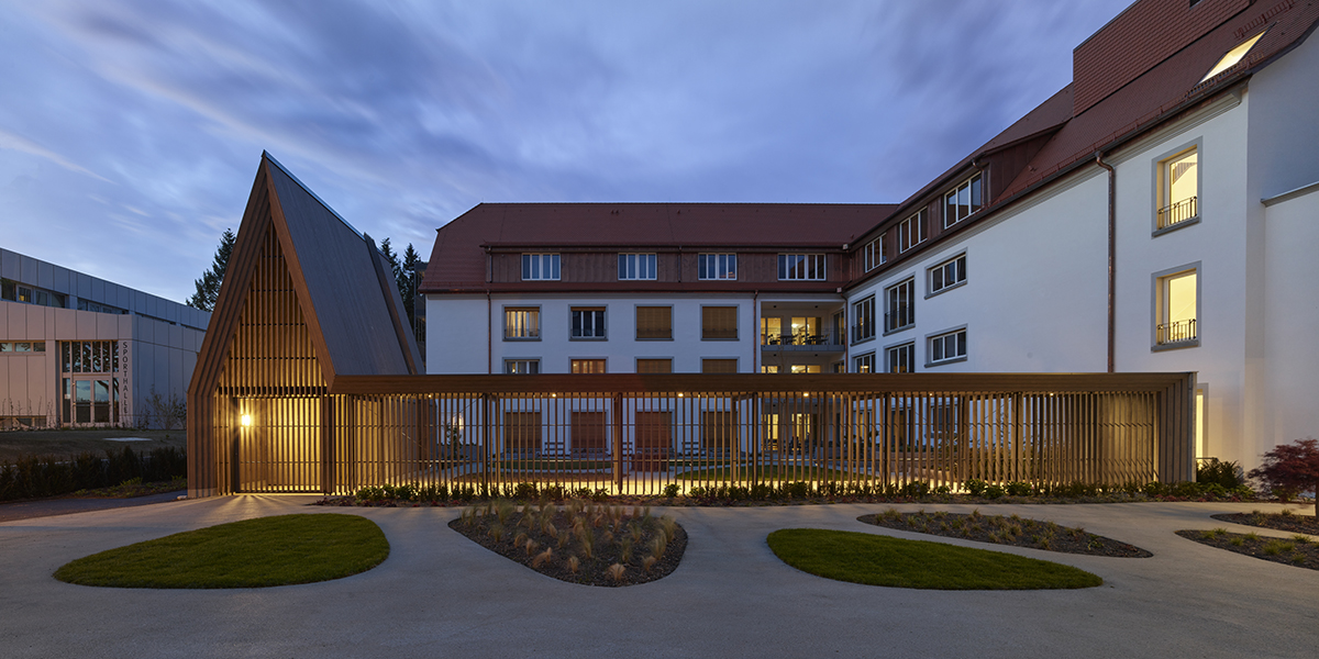 Die Kapelle mit Verbindungsgang bildet mit dem Winkelbau des neuen Pflegeheims einen Hof. Zum einen ein tradiertes Element in der Klosterarchitektur zum anderen ein wichtiger, geschützter Freibereich für die Bewohnerinnen des neuen Pflegeheims.