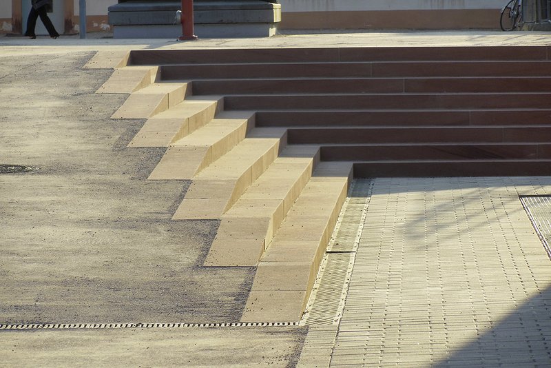 Die Belagsflächen um das Schloss sowie unter den Bäumen sind mit wassergebundener Decke ausgeführt. Zwischen dem Multimedia-Bau und dem Fuchsbau ist ein kleiner eigenständiger Innenhof mit Zierkirschen entstanden. Die Beläge im Hof und um den Neubau sind mit mittelformatigen anthrazitfarbenen Betonsteinen erstellt.Das neue Unterrichtsgebäude im Nordosten ist über einen gut begehbaren Fußweg aus Betonsteinpflaster erschlossen, der auch zufahrtstauglich für die Anlieferung von Klavieren ist und der Andienung für die Feuerwehr dient. Der Höhenunterschied von EG Schloss zum tiefer liegenden Unterrichtsgebäude um ca. 1,30 m wurde mit einer Sandsteintreppe adäquat der Bestandstreppe im Südosten der Anlage überwunden. Die Treppenstufen sind gleichzeitig Sitzstufen zum Aufenthalt.