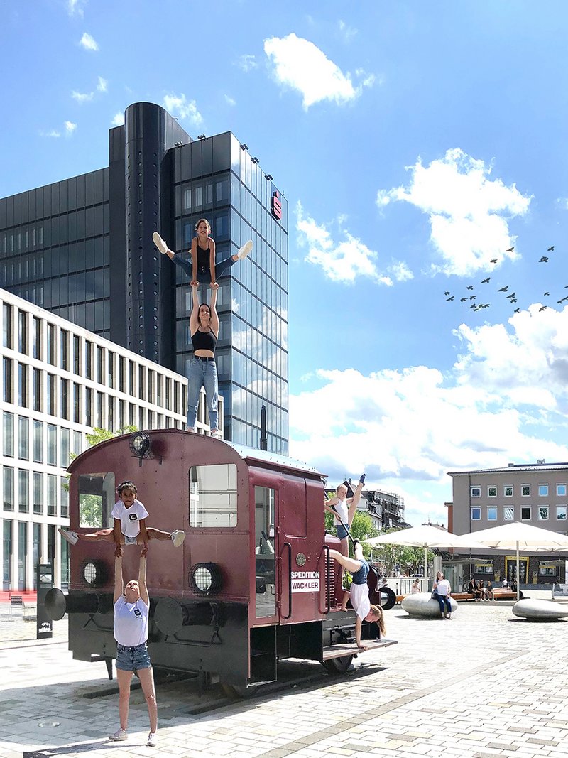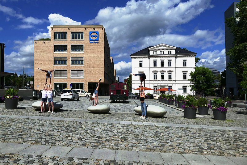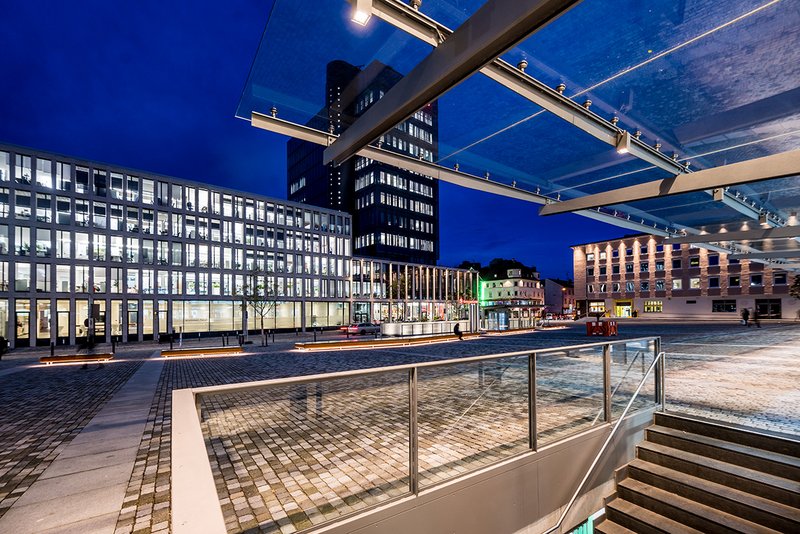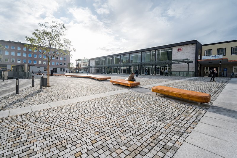 Die neuen Verkehrsangebote, wie Car-Sharing, E-Mobilität, Fahrradparkhaus und Taxistände sowie Zu-/Abfahrt bzw. Zu-/Abgang zur Tiefgarage sind weithin sichtbar und dennoch zurückhaltend um den Platz angeordnet. Auf dem Platz selbst herrscht eine klare Ordnung der Möblierungselemente. Um das Stadtsofa, als Attraktionspunkt des Platzes, reihen sich weitere Sitzmöglichkeiten und Spielkiesel, eine Lok als Ausstellungsobjekt sowie Informationsstelen, ohne miteinander zu konkurrieren. Heute ist der Bahnhofsplatz zusammen mit der Tiefgarage, dem regionalen Mobilitätspunkt im Bahnhof und dem benachbarten Busbahnhof eine intermodale Mobilitätsdrehscheibe und zugleich attraktiver Aufenthaltsort, Orientierungspunkt für verschiedene Nutzergruppen und das neue Entrée zur Innenstadt