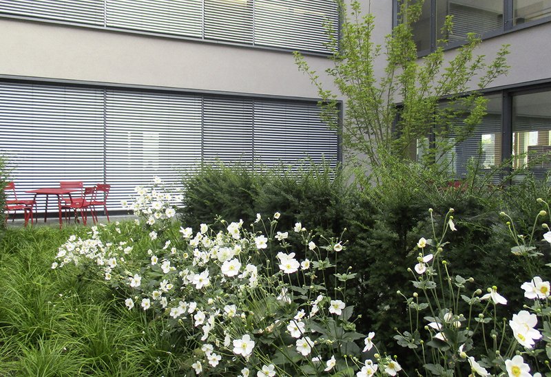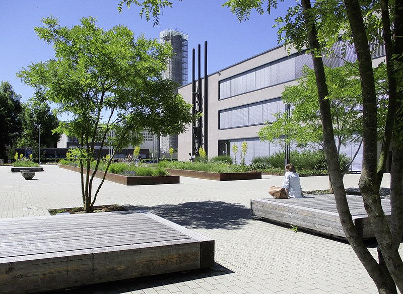 AußenanlagenDie Außenanlagen des neuen Berufsschulzentrums Radolfzell gliedern sich in verschiedene Bereiche: Ankommen, sich sammeln, in den Unterricht strömen … der Begrüßungshof empfängt Schüler und Lehrer. Der mit mehrstämmigen Schnurbäumen bestandene Platz wird durch artenreich bepflanzte Stahltröge unterbrochen. Dadurch ergeben sich vielfältige Wegestrukturen, die zum Haupteingang und der neuen Turnhalle führen. Sitzdecks aus Holz laden zur Kommunikation in der Pause ein.