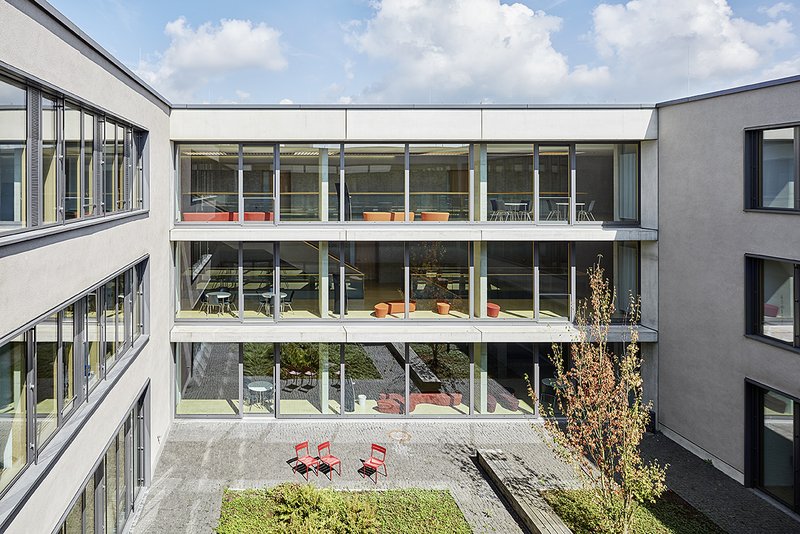 Die beiden Schulgebäude bestehen jeweils aus einem kompakten Atriumtyp, die über eine durchgehende Haupterschließung (Magistrale) räumlich verknüpft sind und die den zur Stadt orientierten Haupteingang mit dem Eingang vom Park verbindet. Zusammen mit den großzügig dimensionierten Innenhöfen entsteht eine klare, übersichtliche und räumlich interessante Erschließung bei gleichzeitig kurzen Wegen. Alle Gebäude sind in massiver Ortbetonbauweise realisiert. Allen Gebäuden liegt ein einheitliches Materialkonzept zugrunde. Für die Aussenfassaden wurde ein WDVS mit mineralischem Kratzputz beschlossen. Die Fassaden sind durch Fensterbänder stark horizontal gegliedert. Dunkle Metallfenster stehen in Kontrast zu hellen Putzflächen. Die durch die Glasfassaden hindurch sichtbaren Stützen wurden entsprechend einem von Harald F. Müller entwickelten Farbkonzept mit leuchtenden Farben gestrichen. Dadurch entsteht über die Geschosse hinweg eine barcodeartige Rythmisierung der Fassaden. Die Eingänge und die dazugehörenden Vordächer sind durch Betonfertigteile betont.