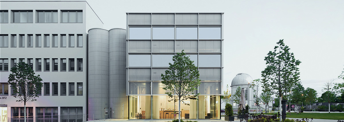 Der selbstbewusst zurückhaltende Erweiterungsbau des Biotechnologie-Zentrums ist als Zusammenspiel aus einem schlanken, skelettierten Gebäuderiegel mit ausgelagerten Infrastrukturkernen entwickelt. Diese Erweiterungsstrategie schafft funktionale Verbindungen und einen geschützten Hof in Richtung Bestand und einen eigenständigen, autonom wirkenden Solitär in Richtung Platz. Die runde Form der Infrastruktur-Kerne nimmt Bezug zur benachbarten Sternwarte, während der ruhige, klar strukturierte Baukörper mit einem überhöhten Foyer und einer Café-Bar eine neue Adresse mit starker Präsenz am Platz markiert.