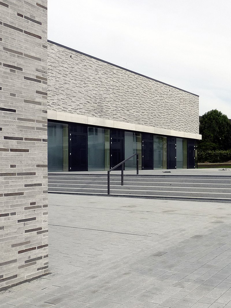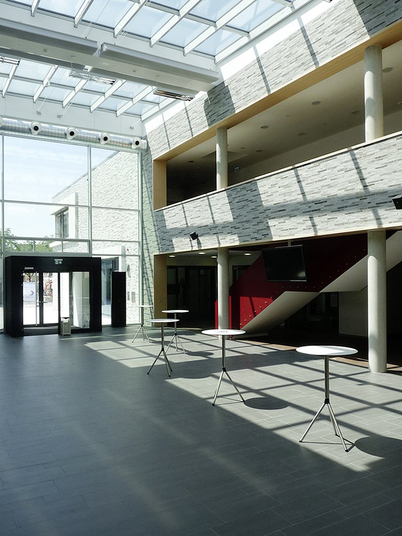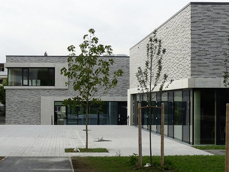 Das Café an der Nordwestseite des Gebäudes ist gut sichtbar platziert und bildet in der speziellen Ortsituation einen interessanten Auftakt zu dem Ensemble. Für die Fassade wurde ein robustes Material gewählt, die Fensterflächen sind in einem spannungsvollen Verhältnis zu den geschlossenen Klinkerflächen eingeschnitten. Für den Innenausbau kamen natürliche Materialien zum Einsatz (Holzfenster, Holztüren, Lamellenparkett, Linoleum, Gipskarton usw.). Das Material- und Farbkonzept zielt auf eine freundliche und offene Wirkung ab. Der Dreiklang von dunklen und hellen Hölzern sowie weißen Wandflächen schafft eine einfache aber gleichzeitig hochwertige Wirkung der Innenräume. Für die Gestaltung der Freiflächen wurde ebenfalls eine reduzierte Formensprache umgesetzt. Die Beschränkung in der Materialwahl schafft eine klare und einfache Grundhaltung in der Behandlung des öffentlichen Raumes. Möblierungselemente wurden an ausgewählten Stellen in reduziertem Umfang eingesetzt. Einzelne Solitärbäume ergänzen die vorhandene Grünraumsituation.