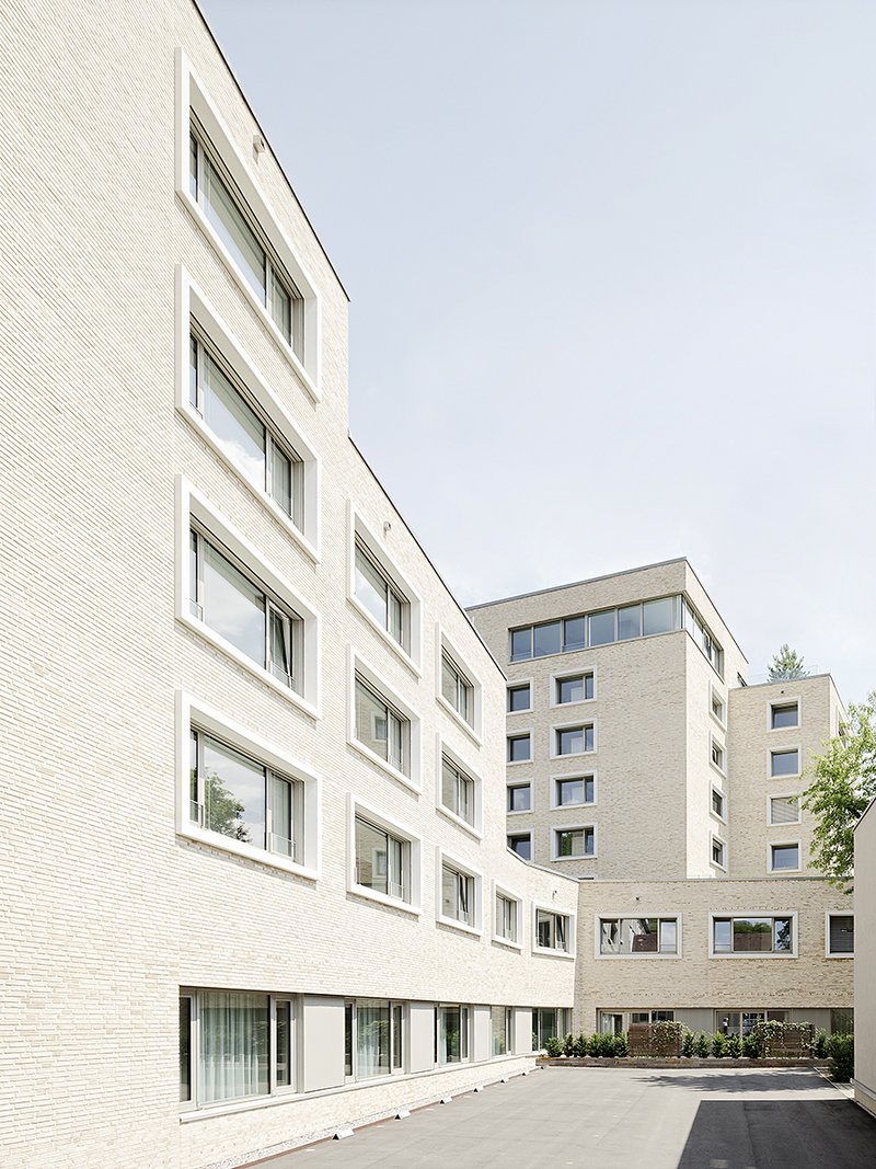 Die baukörperliche Ausformulierung des Gebäudes entwickelt sich aus den vorhandenen Rahmenbedingungen, Abstandsflächen und Grenzverläufen und nutzt das Grundstück baurechtlich voll aus. Gemeinsam mit dem Otto-Riethmüller-Haus werden über Ergänzungsbauten im Sockelbereich städtebaulich wirksame Raumkanten und eine Adresse zur Berliner Straße geschaffen. Dem Georgii-Gymnasium wird ein fünfgeschossiger neuer Baukörper gegenübergestellt. Prägnant und zeichenhaft bildet das transformierte, achtgeschossige ehemalige Studentenwohnheim den Hochpunkt der Anlage.Aufgrund der statisch ausgereizten Primärstruktur des ehemaligen Studentenwohnheims war es nicht möglich, die ursprünglich vorgesehene Umstrukturierung der Fassade umzusetzen, um den transparenten Fassadenanteil zu erhöhen. Aus dieser statischen Vorgabe heraus wurde eine klassische Lochfassade entwickelt und umgesetzt. Über eine sorgfältige Detailierung der Betonfertigteilfaschen aus Weissbeton und einer homogenen Klinkervorsatzschale aus handwerklich gefertigten Wasserstrichziegeln werden Alt- und Neubauteile miteinander verknüpft und Bezüge zur historischen Backsteinarchitektur der angrenzenden Esslinger Weststadt hergestellt.