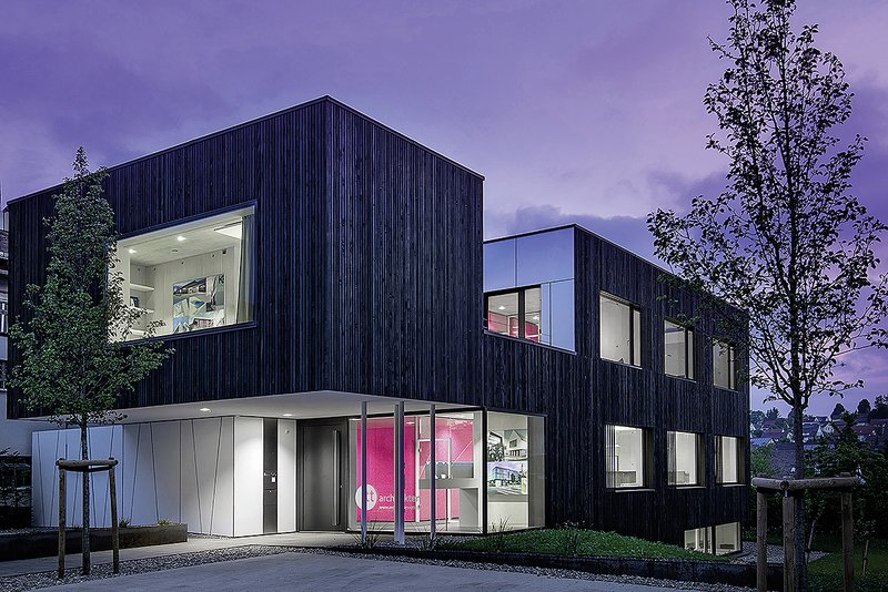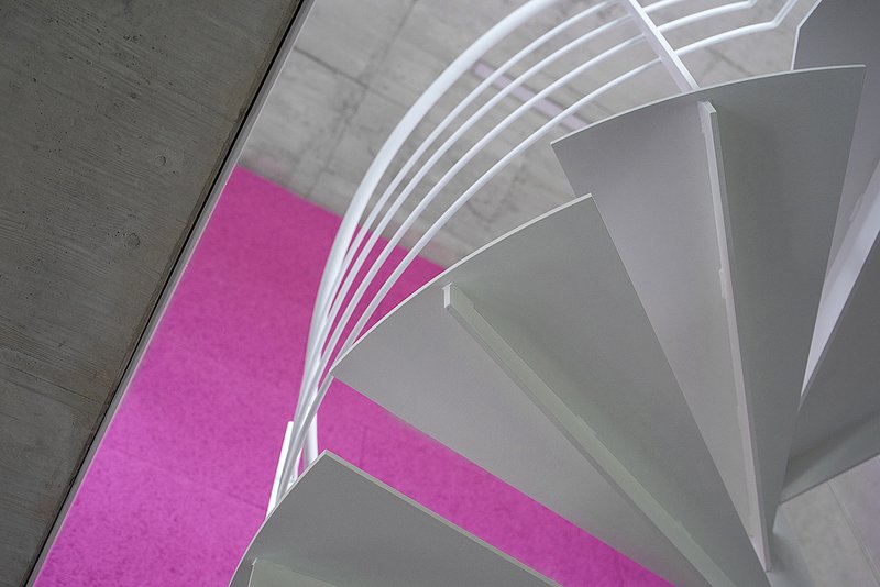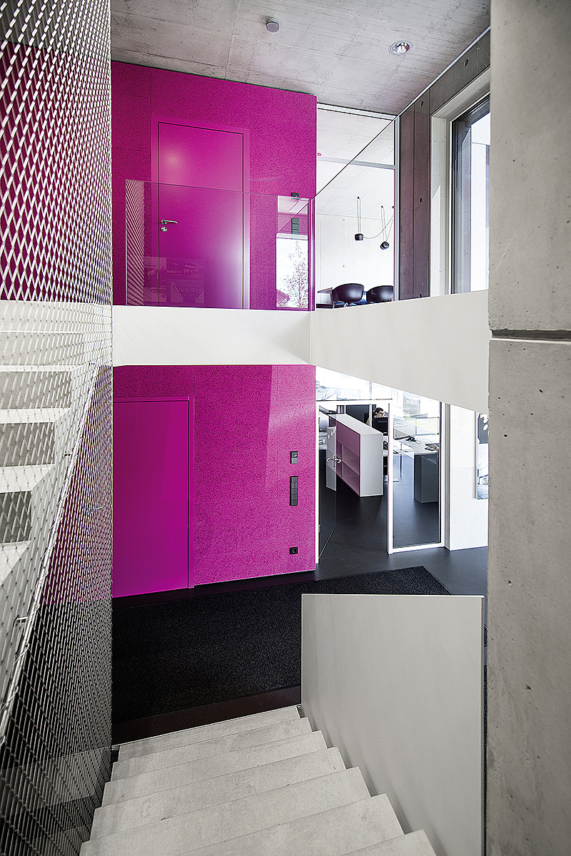 Der Innenraum wird bestimmt von Transparenz und Offenheit. Sichtbeton, schwarzer Linoleumboden, heimisches Fichtenholz an Fenstern und Fassade und weiße Möbel ergeben einen harmonischen Mix natürlicher Materialien. Den farblichen Akzent setzt die magentafarbene "Box" in allen Geschossen. Ihre Verkleidung aus einfachen Holzwolle-Platten stellt die gedämpfte Raumakustik her und birgt kompakt sämtliche Funktionsräume sowie die Trassenführung der Haustechnik. Die filigrane, offene Spindeltreppe vernetzt die Arbeitsbereiche auf allen drei Ebenen unmittelbar.