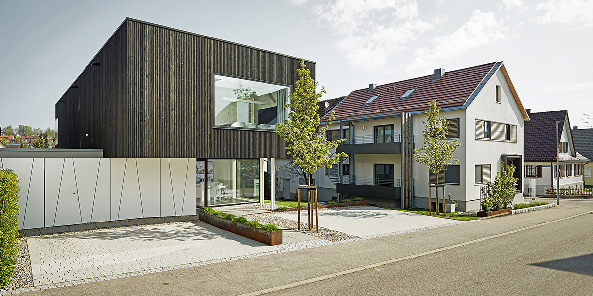 Auf begrenzter Fläche entstand ein kompakter, markanter und in seinem Inneren dennoch großzügiger Baukörper mit 350 m² Nutzfläche, ca. 1.530 m³ Volumen, bis zu 14 zeitgemäßen Arbeitsplätzen und hoher Aufenthaltsqualität in fußläufiger Entfernung zur Laichinger Innenstadt.