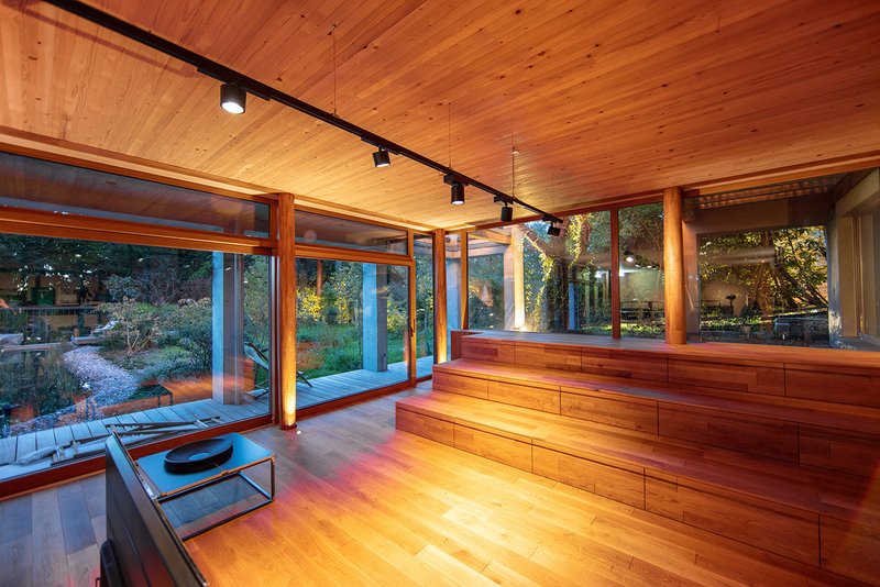 Ein Pflaumenbaum, der scheinbar organisch in die Struktur des Hauses hineinwächst, unterstreicht die subtile Integration des Gebäudes in das bestehende Landschaftsbild, auch die Fassadenbegrünung des Dschungelhauses trägt maßgeblich zu dessen Einbettung in die Natur bei. Auf dem Dach entfaltet sich die Idee der Symbiose weiter: Mit der Zeit wird es von einer dichten Vegetation bedeckt, die ökologisch sinnvoll ist und eine optische Pracht entfaltet. Sie verbessert die Isolation und schafft zusätzlichen Lebensraum für Pflanzen und Insekten.