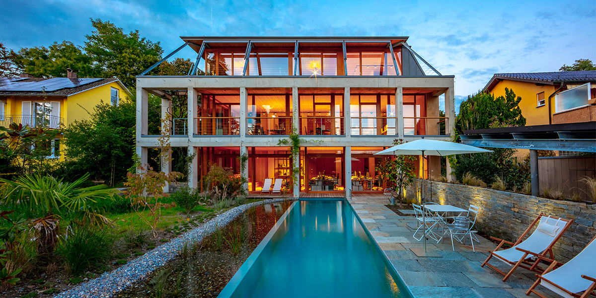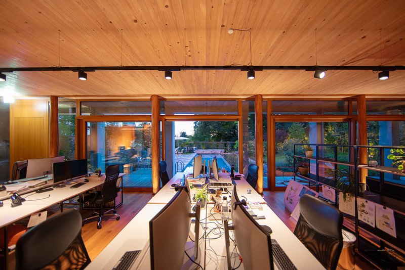 Ein Garten voller LebenDer angrenzende Garten des Dschungelhauses ist ein sorgfältig gestalteter Naturraum, der den Büroalltag in eine grüne Idylle verwandelt. Hier wurden Pflanzen ausgewählt, die sowohl klimaresistent als auch ökologisch wertvoll sind – ein Schlüsselelement des Gartens. Es wäre aber kein Dschungelhaus, wenn nicht ein Hauch Exotik dabei wäre, wie Baumfarn, Bitterorangen und robuste Hanfpalmen. Der Naturpool im Garten, bestehend aus Schwimmbereich und Filterzone, ist ein weiteres Highlight: ohne chemische Zusätze sorgt die natürliche Filterzone dafür, dass das Wasser kristallklar bleibt – eine umweltfreundliche Alternative zu herkömmlichen Schwimmbecken.