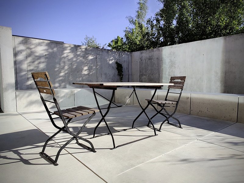 LandschaftsarchitekturDie klare Gestaltung des Baukörpers spiegelt sich in den Freianlagen: Der Haupteingang von der Albstraße auf der Südseite und der Eingang für die Mitarbeiter auf der Nordseite (Parkplatzseite) sind über eine raue Drainbeton-Fläche erschlossen. Der kühle Beton inszeniert in besonderer Weise die warme Holzfassade. Die Struktur der begrünten Stellplätze greift die Strukturen der Fassade auf. Baukörper und Freianlagen ergänzen sich zu einem einheitlichen und stimmigen Gesamtbild in der Vertikalen und der Horizontalen. Akzente setzen Solitärgehölze, Strauchgruppen und Schnitthecken.Auch der klar gestaltete Mitarbeitergarten mit herrlichem Ausblick in Richtung Schwäbische Alb führt mit Beton-Großformatplatten und Beton-Sitzelementen umrahmt von einer Sichtbetonmauer die Gestaltungssprache des Gebäudes fort. Die monolithische Form der Aufenthaltsflächen wird durch freiwachsendes Grün umspielt und bietet Mitarbeitern wie Besuchern einen schönen Ort zum Entspannen.
