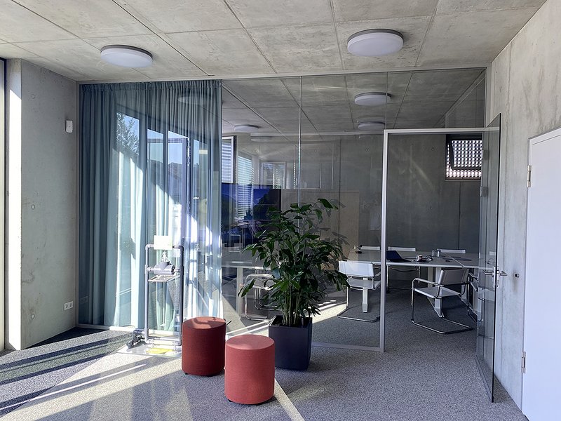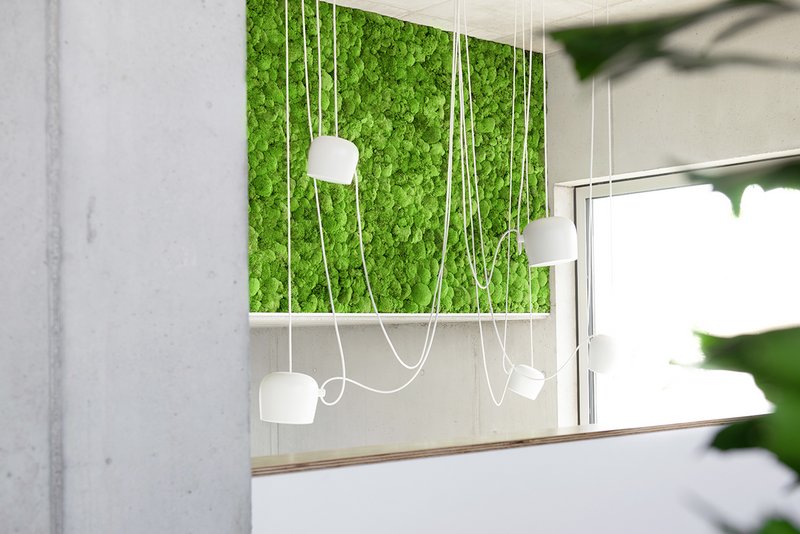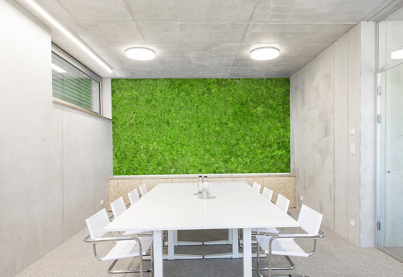 InnenarchitekturDie Architektur des Gebäudes ermöglicht eine flexible und vielseitige Nutzung des Innenraums und schafft eine besondere Atmosphäre auf mehreren Ebenen, auf denen offene und kommunikative Raumstrukturen fließend ineinander übergehen. Große Fenster sorgen für viel Licht und prägen die holzverkleidete Fassade.Bei der Materialwahl im Innern fiel die Entscheidung auf Sichtbeton: Wände und Decken wurden absichtlich roh belassen. Im Kontrast dazu stehen Ausgestaltung und Einrichtung: Mooswände setzen landschaftliche Akzente und sorgen für eine gute Raumakustik. Auf rund 780 Quadratmetern wurde eine innovative Arbeitswelt mit differenzierten Aufenthalts- und Kommunikationsebenen für die Mitarbeiter verwirklicht.