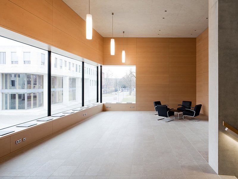 Als Naturstein für Fassade und Fußböden wurde ein Crailsheimer Muschelkalk mit bräunlichen Einschlüssen ausgewählt. Der Sichtbeton mit Muschelkalkzuschlagsstoffen ist weißlich eingefärbt und nachträglich lasiert. Als Holz wurde für die teilweise mikroperforierten Wandbekleidungen und Türen ein weißpigmentiertes Eichenfurnier ausgesucht. Verglasungen in verschiedensten Ausformungen sind in einer Pfosten-Riegel-Konstruktion in bronziertem Farbton passend zum Muschelkalk gefasst. Das Geländer der Treppe besteht aus weiß gestrichenen flächigen Stahlplatten mit Eichenhandlauf und integrierte LED-Beleuchtung.