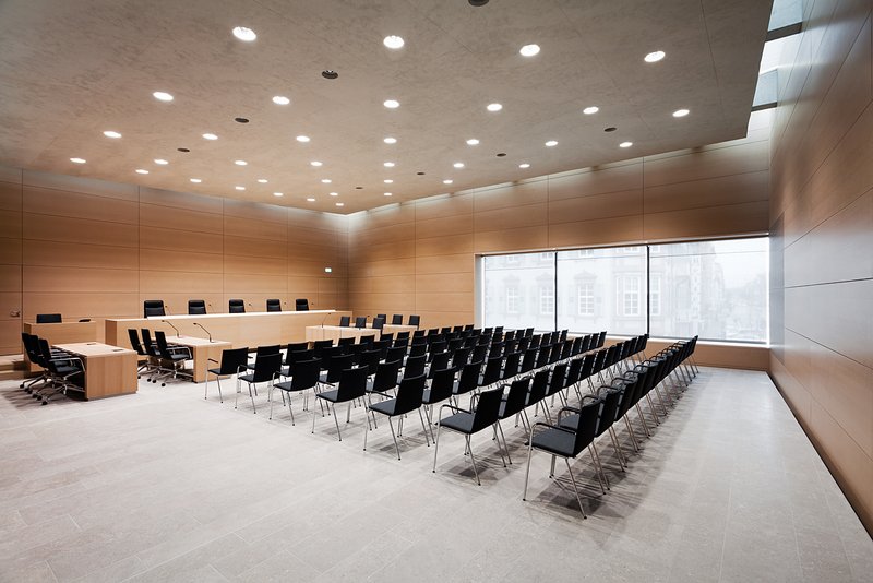 Die Fensteröffnungen im 1. Obergeschoss des Gerichtssaales setzen gezielte Außenbezüge in den öffentlichen Raum und in den attraktiven Innenhof des BGH. Das Dachoberlicht ist ringsum wandbegleitend. Somit setzt sich die Decke im Sitzungssaal von den Außenwänden ab und lässt sie schweben. Zenitlicht streift die holzverkleideten Wände des großen Gerichtssaales, unterstreicht die leichte "Faltung" der Innenhülle.